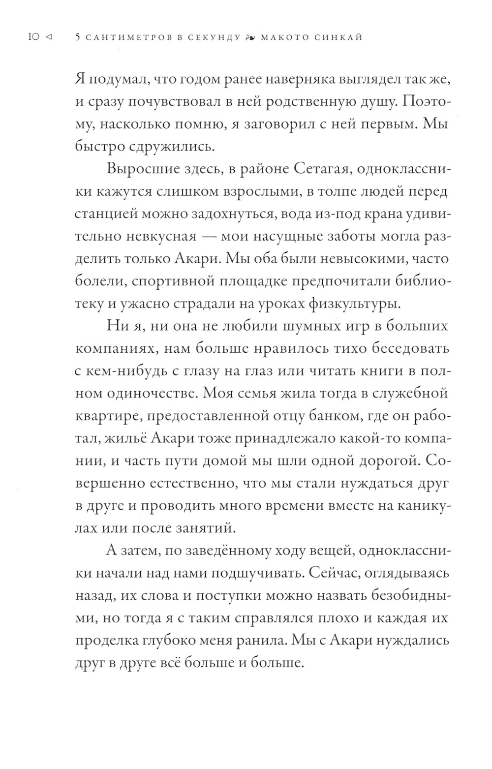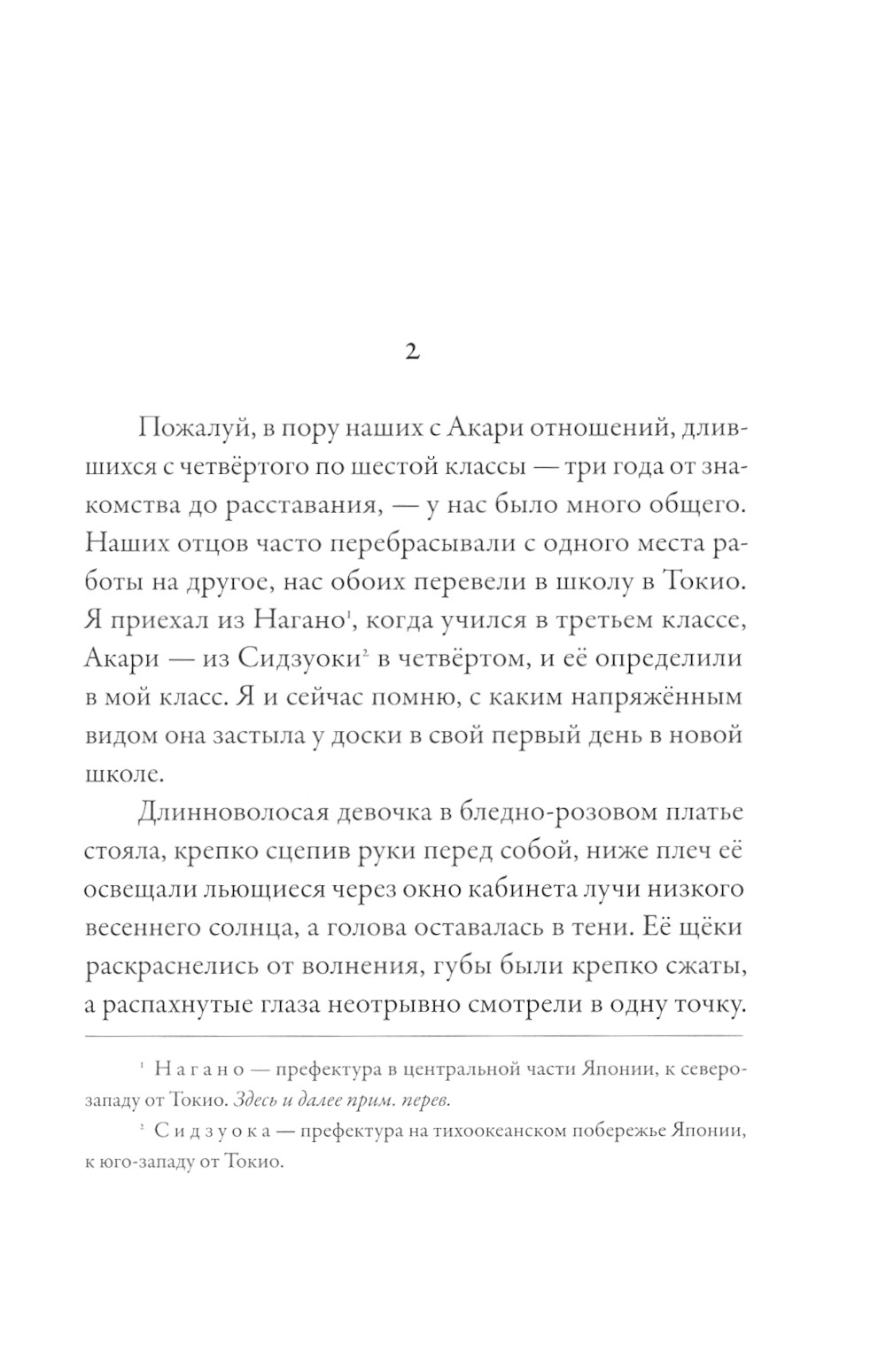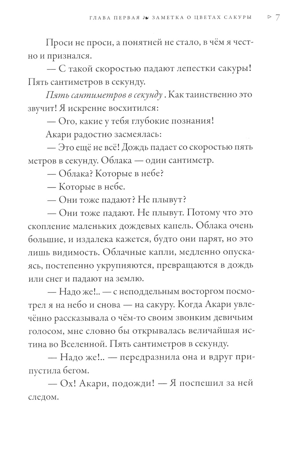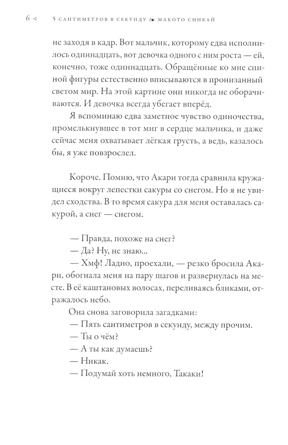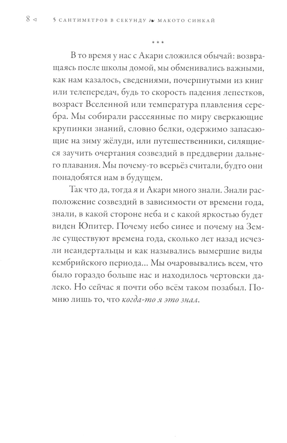 Акари всегда готова рассказать что-то интересное, а Такаки - защитить Акари. Знакомые с младшей школы, они вынуждены расстаться в средней. Но трепетное сердце неподвластно смятению души... Внутренний мир героев ленты «5 сантиметров в секунду» с изяществом мастера воссоздан в книге режиссёра Макото Синкая. Три повести - три истории из жизни обычного подростка.