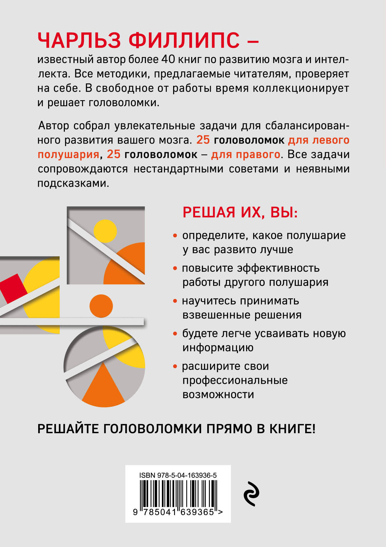 Чарльз Филлипс - известный автор более 40 книг по развитию мозга и интеллекта. Все методики, предлагаемые читателям, проверяет на себе. В свободное от работы время коллекционирует и решает головоломки. Вас когда-нибудь удивляли собственные решения? Бывает так, что вы долго бьетесь над какой-то проблемой, и вдруг ответ приходит будто сам собой? Конфликт между логикой и инстинктом, рассудком и интуицией, сознательным и неосознанным принятием решений происходит от того, что головной мозг разделен на левое и правое полушария. Чарльз Филлипс собрал 50 увлекательных головоломок для сбалансированного развития левого (рационального, интеллектуального) и правого (эмоционального, творческого) полушарий мозга. Решая их, вы: • определите, какое полушарие у вас развито лучше; • повысите эффективность работы другого полушария; • научитесь принимать взвешенные решения; • будете легче усваивать новую информацию; • расширите свои профессиональные возможности. Сюжеты головоломок увлекательны и нетривиальны. Все задачи сопровождаются нестандартными советами и неявными подсказками. Каждую головоломку можно решать прямо в книге.| Издательство | Эксмо |