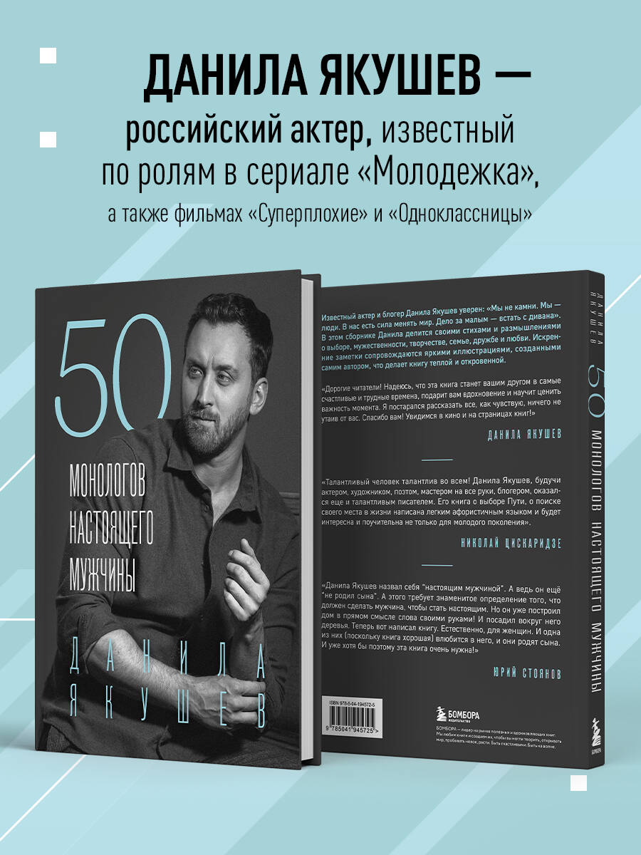 ОТЗЫВЫ «Талантливый человек талантлив во всем! Данила Якушев, будучи актером, художником, поэтом, мастером на все руки, блогером, оказался еще и талантливым писателем. Его книга о выборе Пути, о поиске своего места в жизни написана легким афористичным языком и будет интересна и поучительна не только для молодого поколения». - Николай Цискаридзе «Данила Якушев назвал себя "настоящим мужчиной". А ведь он ещё "не родил сына". А этого требует знаменитое определение того, что должен сделать мужчина, чтобы стать настоящим. Но он уже построил дом в прямом смысле слова своими руками! И посадил вокруг него деревья. Теперь вот написал книгу. Естественно, для женщин. И одна из них (поскольку книга хорошая) влюбится в него, и они родят сына. И уже хотя бы поэтому эта книга очень нужна!» - Юрий Стоянов ЦИТАТЫ: МЫ С ВАМИ УЖЕ ДАЛЕКО НЕ ДЕТИ, ЧТОБЫ ДУМАТЬ, ЧТО СЧАСТЬЕ - ЭТО ОГРОМНЫЙ ОСОБНЯК ИЛИ ЯХТА В ОКЕАНЕ. СЧАСТЬЕ - В ОКРУЖАЮЩИХ НАС МЕЛОЧАХ. ПОМНИТЕ, У ВАС ЕСТЬ ОДНА ЖИЗНЬ, КОТОРАЯ ПРОХОДИТ ЗДЕСЬ И СЕЙЧАС, НА ЭТОЙ ПЛАНЕТЕ. РЕАЛИЗУЙТЕ СВОЙ ПОТЕНЦИАЛ, ПОКА ЕСТЬ ВОЗМОЖНОСТЬ! ЕСЛИ ВКЛАДЫВАТЬ ВО ЧТО-ТО ВСЮ ДУШУ, ИСКРЕННЕ И ВСЕЦЕЛО ПОГРУЖАТЬСЯ В СВОЕ ДЕЛО - ОБЯЗАТЕЛЬНО НАЙДУТСЯ ТЕ, КОМУ ВАШЕ ТВОРЧЕСТВО БУДЕТ НЕБЕЗРАЗЛИЧНО. КОМУ-ТО ОНО ОБЯЗАТЕЛЬНО БУДЕТ НУЖНО. И БЛИЗКО. СТОИТ ПРОБОВАТЬ НОВОЕ. ПРОСТО БРАТЬ И ДЕЛАТЬ ТО, К ЧЕМУ ВЕДЕТ ВАС КРЕАТИВ. НАУЧИТЕСЬ ЛЮБИТЬ ИСТОРИЮ СВОЕЙ ЖИЗНИ. ИСТОРИЮ СВОИХ ПОБЕД И ПОРАЖЕНИЙ. ВСЕ, ЧТО С ВАМИ ПРОИСХОДИЛО, СФОРМИРОВАЛО ТОГО, КТО ВЫ ЕСТЬ СЕЙЧАС.| Издательство | ООО "Издательство "Эксмо" |