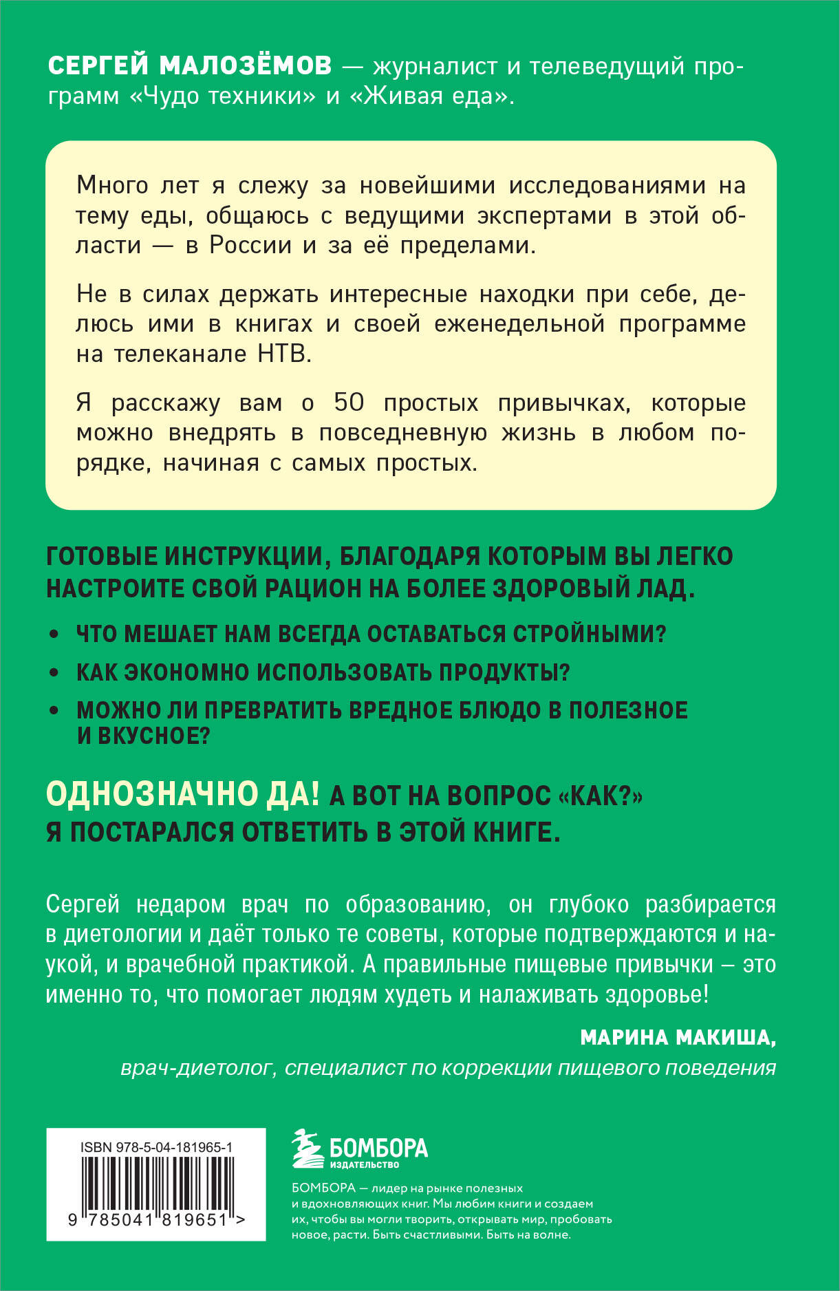 • Автор - известный телеведущий, дипломированный врач, создатель научно-популярных телепрограмм «Чудо техники» и «Живая еда», много лет изучающий питание. • Практические советы для постепенного включения правильных пищевых привычек в повседневную жизнь. • Простые рецепты, которые позволят готовить вкусные, полезные и быстрые блюда.
