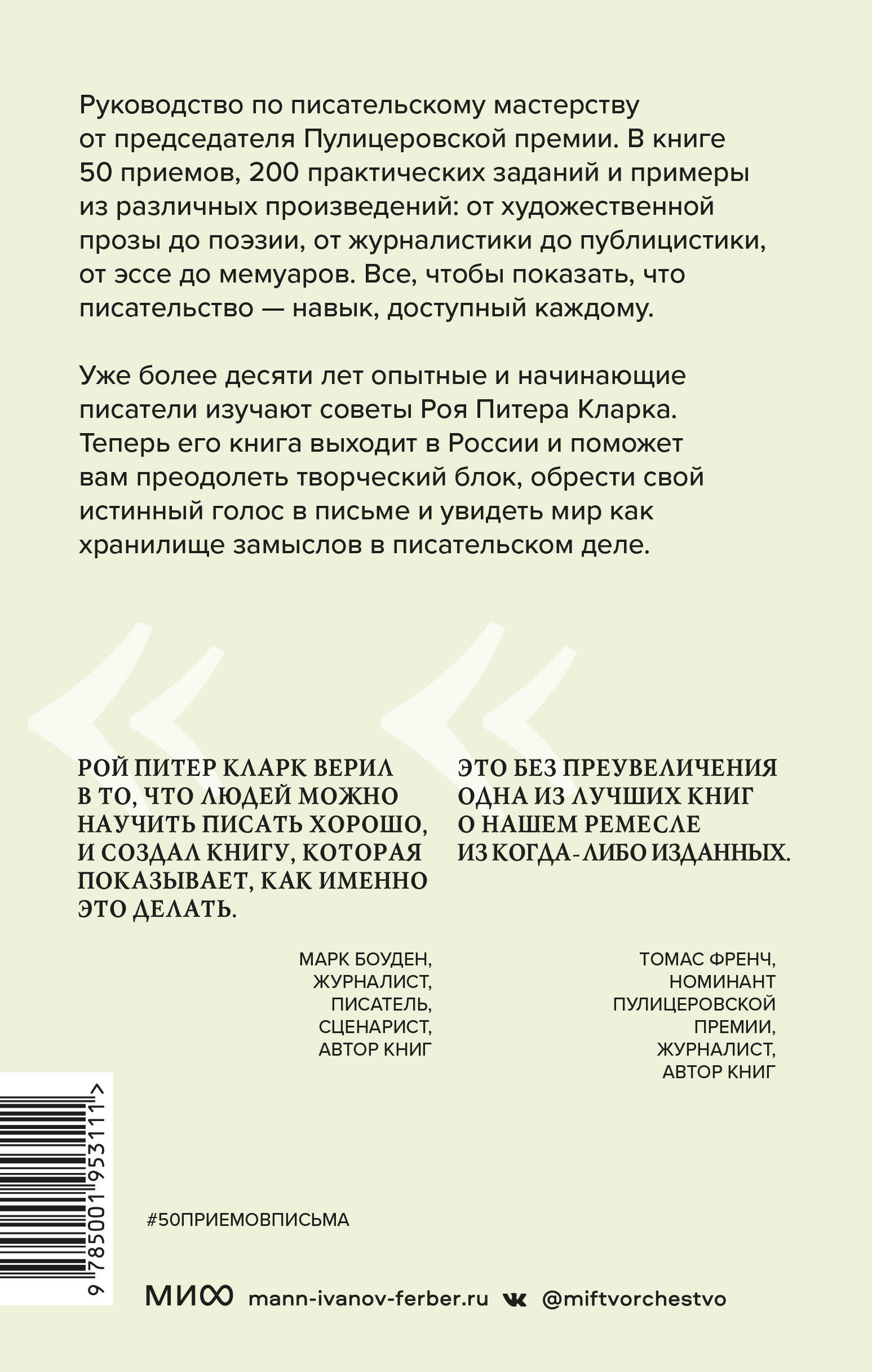 Одна из самых известных книг о писательском мастерстве, в США вышло 18 переизданий. Рой Питер Кларк - неоднократный председатель и член жюри Пулитцеровской премии, журналист, редактор, преподаватель, "самый авторитетный американский тренер по письму" с более чем 30-летним стажем. Автор и редактор 17 книг по писательству и журналистике. Внутри 50 приемов, основанных на примерах из произведений разных жанров, от художественной прозы до поэзии, от мемуаристики до публицистики, и 200 практических заданий, чтобы преодолеть сомнения и создать свой идеальный текст. Набор инструментов разделен на четыре блока: Основы и стратегии. Спецэффекты: экономия, ясность, оригинальность и убеждение. План: способы организации и написания историй и репортажей. Полезные привычки: правила для плодотворного писательства. От автора: Итак, что у вас есть: новый набор писательских инструментов и рабочее место для их хранения. Используйте их правильно, чтобы учиться, обрести свой истинный голос и видеть мир - удивительно яркий - как кладезь идей для историй. Используйте их, чтобы стать лучшим учеником, лучшим учителем, лучшим работником, лучшим родителем, лучшим гражданином, лучшим человеком. Владейте этими инструментами. Теперь они принадлежат вам. Для кого эта книга: Для тех, кто мечтает написать свою книгу, но не знает основ писательского мастерства. Для всех пишущих людей: писателей, редакторов, журналистов, копирайтеров, сценаристов, драматургов, а также для студентов творческих, гуманитарных специальностей.| Издательство | Манн, Иванов и Фербер |