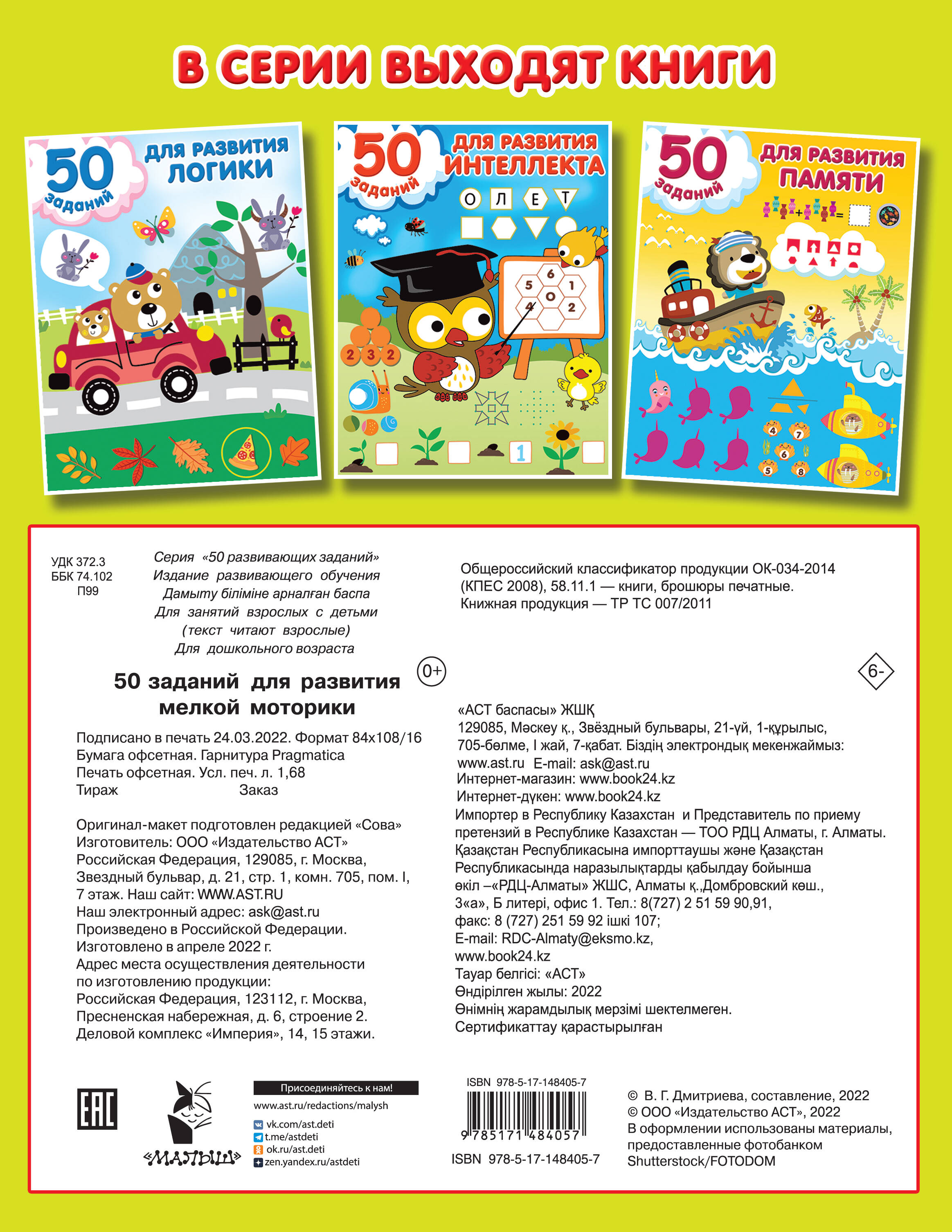 «50 заданий для развития мелкой моторики» - сборник занимательных упражнений для малышей. Увлекательные задания помогут ребёнку потренировать пальчики, развить графические навыки, память, внимание, мышление, речь, а также подарят дошколятам возможность провести время весело и с пользой.