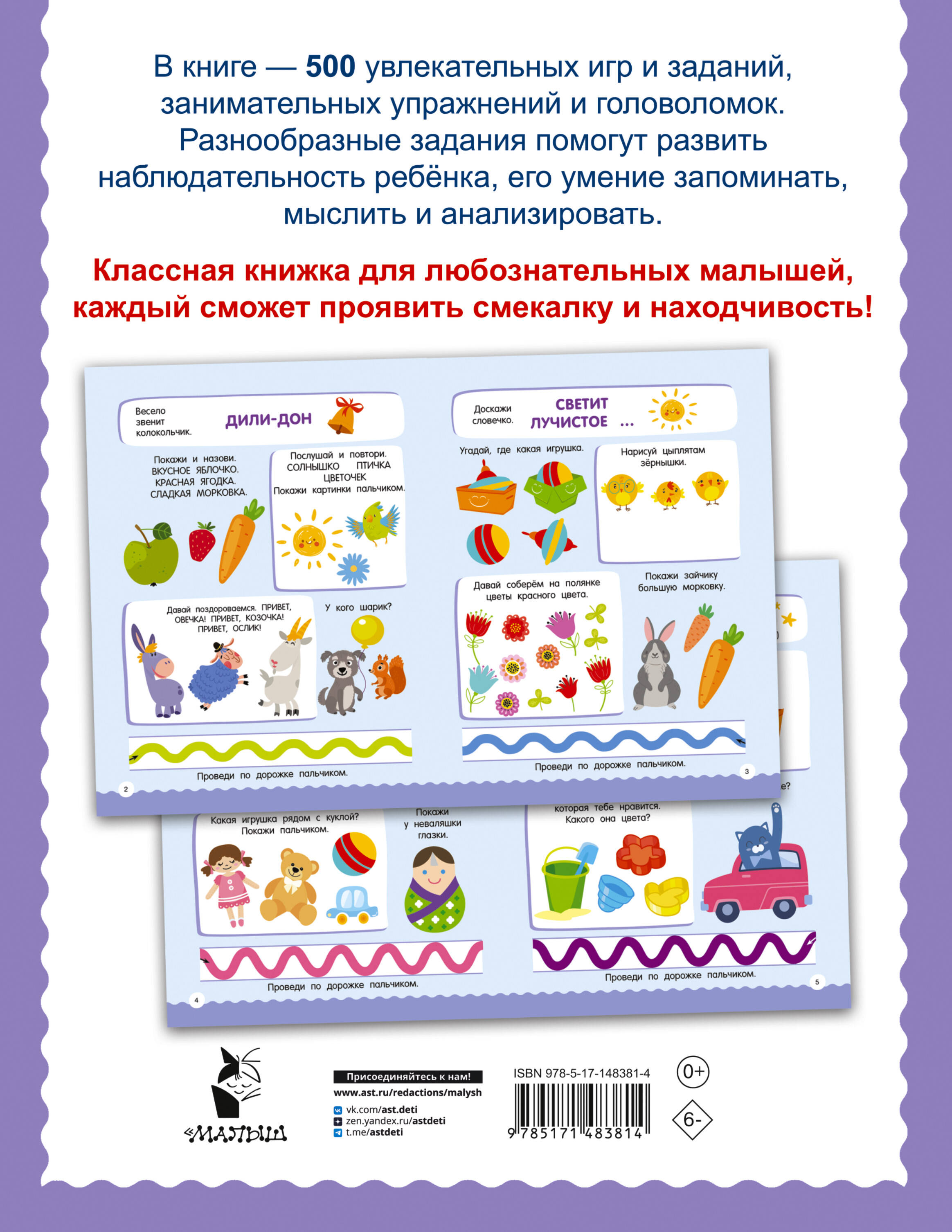 «500 заданий для малышей» - серия, основанная на многолетнем опыте обучения дошкольников. Интересные задания в картинках развивают речь, внимание, память и мелкую моторику. • Книжка обязательно станет одной из любимых у малыша - красочные иллюстрации привлекут его внимание, разовьют познавательный интерес. • Веселые уроки развивают логическое и пространственное мышление, внимание, память, речь, воображение, тренируют мелкую моторику. • Книга будет полезна заботливым родителям, бабушкам и дедушкам, заинтересованным в развитии и обучении малыша. Книга игровых заданий наполнит жизнь ребёнка новыми интересными впечатлениями и полезными знаниями!