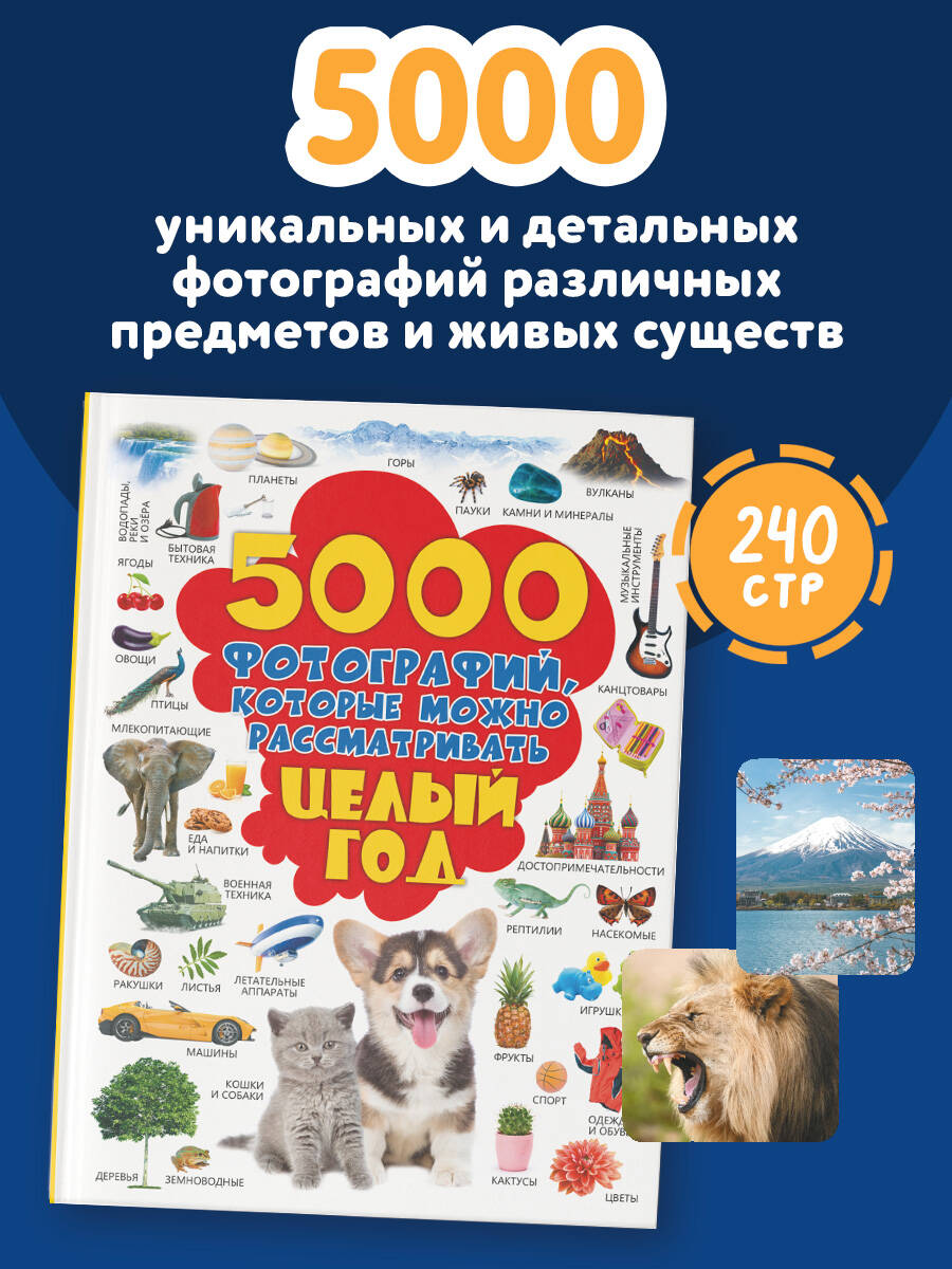 Каждый день малыши задают своим родителям множество вопросов. И сегодня им уже мало просто услышать на них ответы - они хотят всё увидеть собственными глазами. Эта необычная книга идеально подойдёт для решения такой проблемы, ведь на её страницах собрано 5000 уникальных и детальных фотографий различных предметов и живых существ. Их так много, что хватит на целый год. При этом в издании освещены самые развивающие и интересные для ребёнка темы: цвета и формы, растения и животные, времена года и природные явления, города и страны, еда и одежда, техника и даже далёкий космос. Вы не найдёте здесь сложных текстов, которые ещё надо будет объяснить малышу, - только яркие фотографии и краткие подписи к ним. Такой формат издания будет очень полезен ребёнку, ведь изучать объекты и явления он будет не на схематичных картинках, а на реальных детализированных фотоснимках высокого качества.| Издательство | ИЗДАТЕЛЬСТВО "АСТ" |