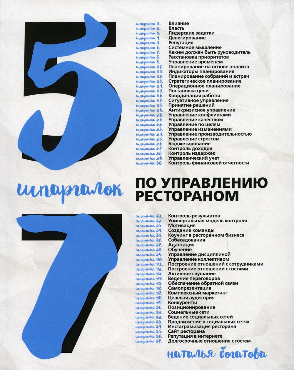 Книга Натальи Богатовой построена на основе ее 16-летнего опыта в ресторанном бизнесе, а также множества бесед с управленцами заведений разных уровней и концепций. Это не учебник с бизнес-определениями, а сборник практических советов, написанных простым языком. Тем не менее основной опыт гуру менеджмента, маркетинга и HR также сюда включен - он делает книгу структурированной и удобной в использовании. С ее помощью вы в любой момент сможете найти ответ на возникший вопрос. В каждой шпаргалке есть краткая справка по теме, кейсы от успешных практиков ресторанной индустрии и задания, которые позволят закрепить материал.| Издательство | Изд.Река |