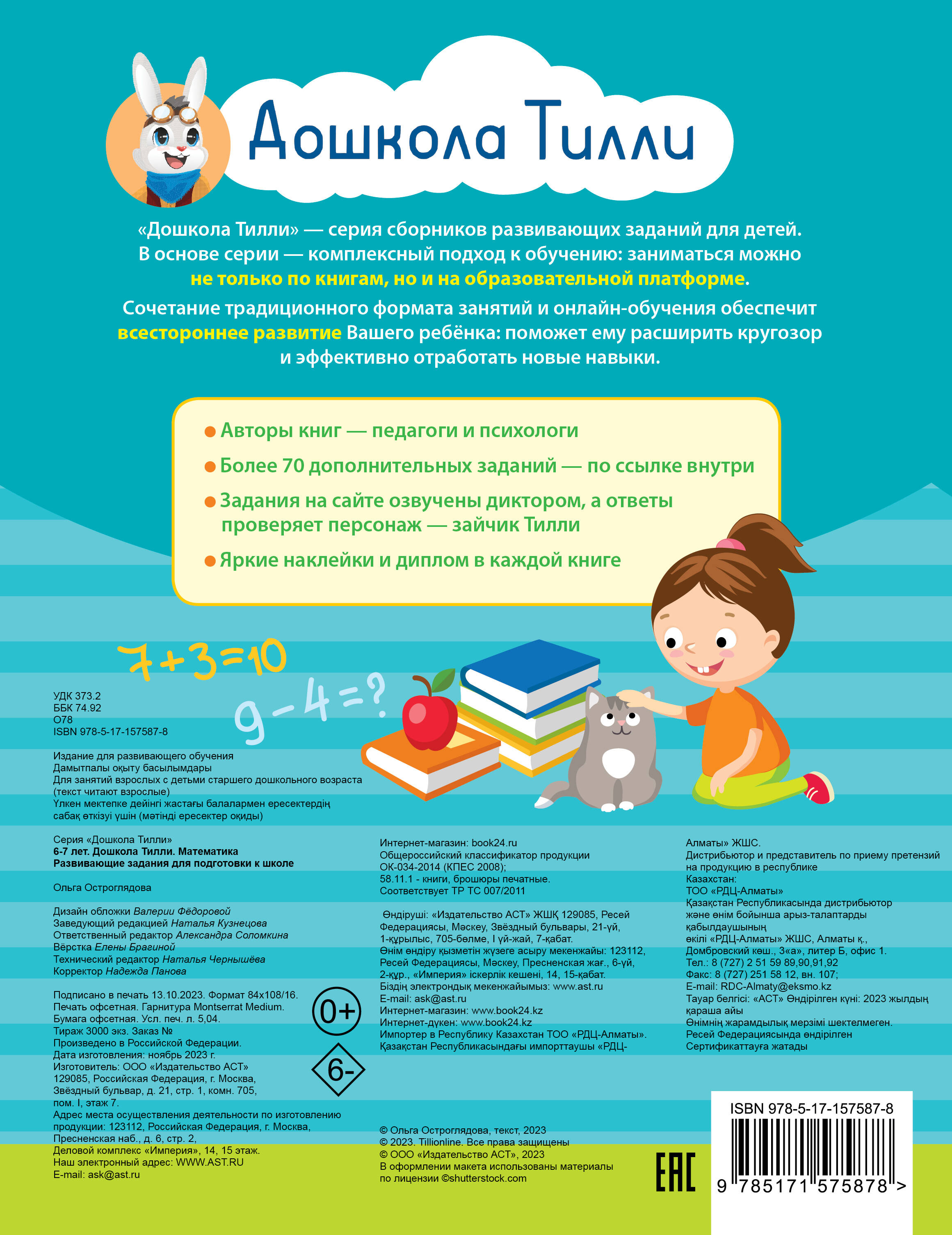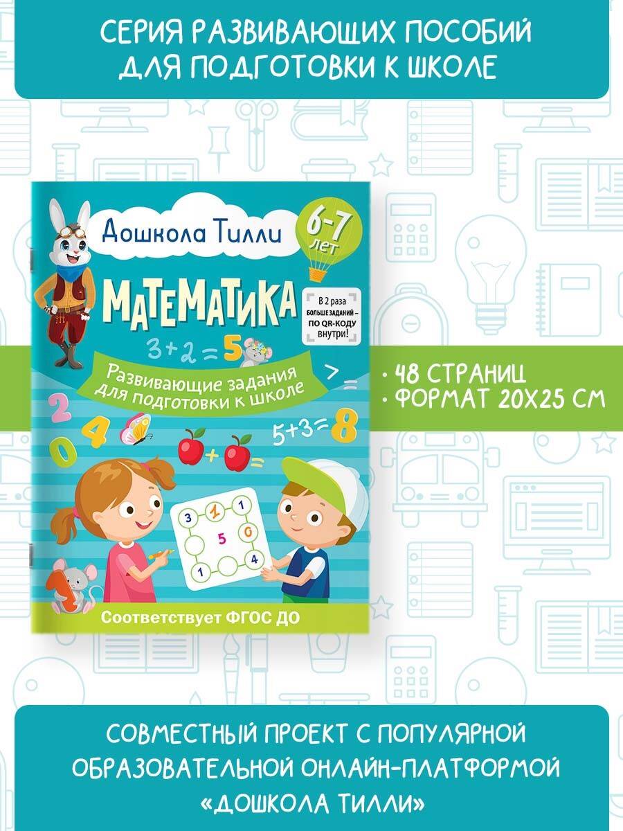 Совместный проект с образовательной онлайн-платформой "Дошкола Тилли" - серия сборников развивающих заданий для детей. В основе серии - комплексный подход к обучению: заниматься можно не только по книгам, но и на образовательной платформе. Сочетание традиционного формата занятий и онлайн-обучения обеспечит всестороннее развитие Вашего ребёнка: поможет ему расширить кругозор и эффективно отработать новые навыки. Главная цель данного сборника заданий - развитие математического мышления у детей 6-7 лет. Упражнения в сборнике помогут усвоить и закрепить знания, необходимые для поступления и лёгкого старта обучения в школе.| Издательство | Издательство "АСТ" |