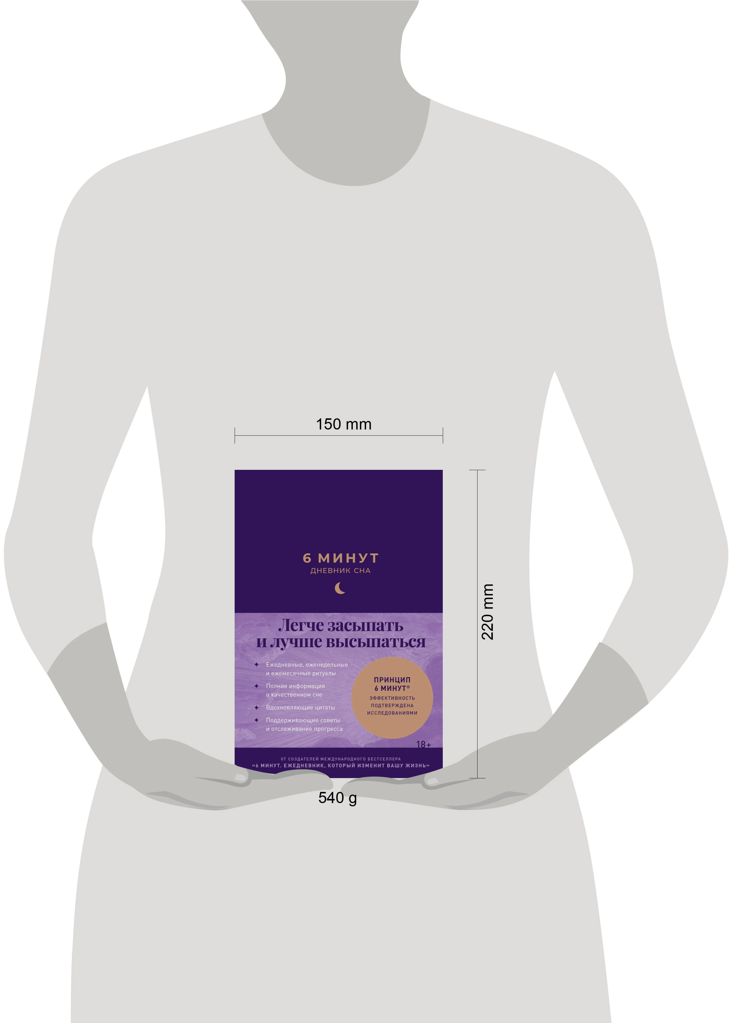 "6 минут" - самый продаваемый мотивационный ежедневник в Германии и России. Бестселлер Amazon, переведен на 20 языков. Каждый день он делает жизнь людей по всему миру более осознанной и счастливой. Используя запатентованный Принцип 6 минут® и результаты современных исследований, Доминик Спенст и его команда создали новый дневник, который помогает заботиться о качестве сна. Сон для организма - одновременно источник молодости, удовольствия, энергии и способ разрядки. Если вы плохо спите, трудно засыпаете и хотите это исправить или если вы хорошо спите, но хотите делать это еще лучше, этот ежедневник для вас. Выполняйте задания, отвечайте на вопросы, записывайте свои наблюдения и спите крепко! 3 минуты утром и 3 минуты вечером, которые изменят вашу жизнь! Десятки лет я не знал никаких трудностей со сном, а потом вдруг разучился спать - и пришлось учиться этому заново. Не приключись с моим сном такая беда, вы бы сейчас не держали эту книгу в руках. Особенности Приятный тканевый переплет Шелковистое ляссе Цветной дизайнерский макет Уникальные авторские рисунки и схемы Сон для организма - одновременно источник молодости, удовольствия, энергии и способ разрядки. Качественный сон оказывает положительное влияние не только на тело. Он вывозит мусор из нашей головы, добавляет продуктивности, проводит сеанс психотерапии и создает хорошее настроение. Для кого Этот дневник нужен тем, кто плохо спит и хочет это исправить; кто не очень хорошо спит и хочет улучшить качество сна; кто хорошо спит, но хочет спать еще лучше. Во сне восстанавливается иммунная система, на следующее утро организм становится более устойчивым к болезням. Если в ночь перед прививкой вы хорошо выспитесь, через 12 месяцев ваш иммунитет будет в два раза сильнее, чем был бы, если бы вы тогда не выспались.