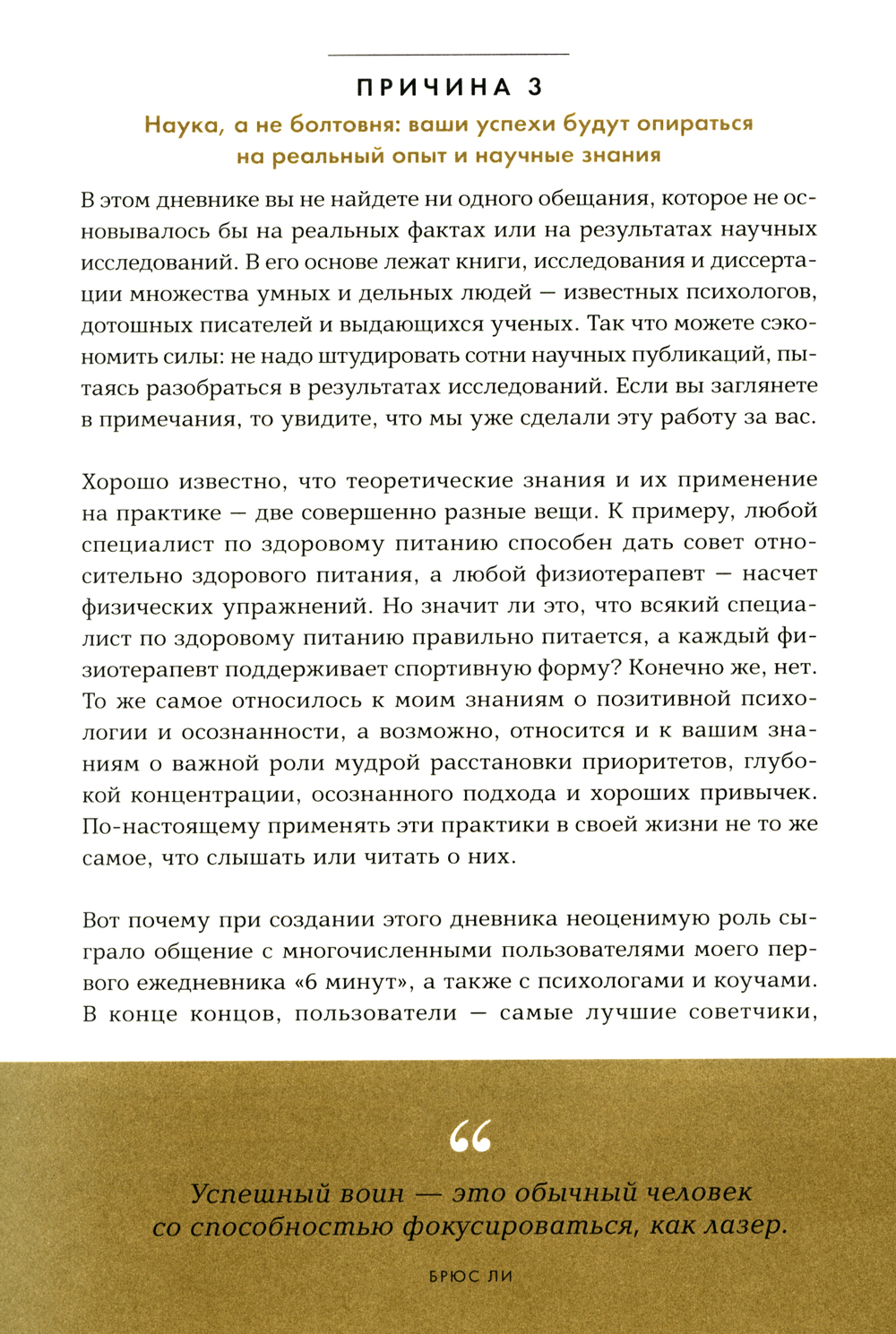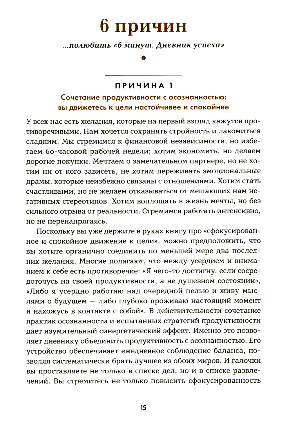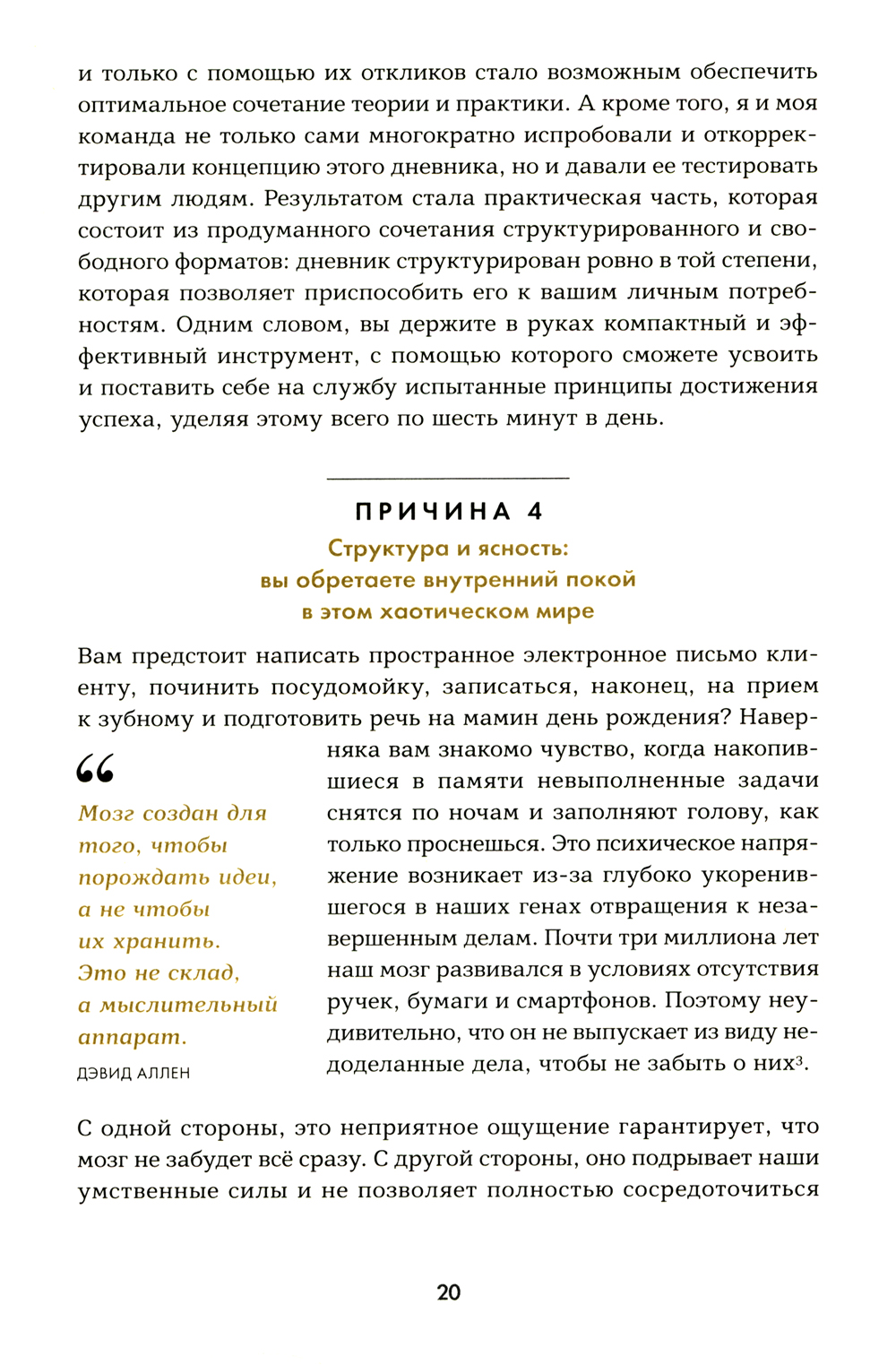 «6 минут. Дневник успеха» - новая книга от автора бестселлера «6 минут. Ежедневник, который изменит вашу жизнь». Доминик Спенст создал уникальный дневник, помогающий последовательно, сконцентрированно и без напряжения идти к поставленной цели. Эта цель будет отвечать вашим желаниям и потребностям, а не чужим ожиданиям. Ведь в основе концепции - ваше собственное определение успеха в профессиональной и личной жизни. С помощью дневника вы узнаете, что на самом деле вами движет, усилите свою мотивацию, сфокусируетесь на главном. Научитесь достигать целей при помощи правильных привычек, скажете «нет» суете и хаосу и «да» - ясности и внутреннему спокойствию. Автор предлагает научно обоснованные, проверенные практикой методы развития осознанности и сосредоточенности. Благодаря им вы сможете без усталости делать больше дел и достигнете большего в своей жизни.| Издательство | Альпина Паблишер |