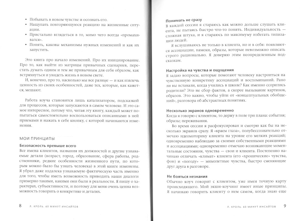 Эта книга состоит из 18-ти часов, 18-ти отдельных коротких сессий-разговоров Леонида Кроля с его клиентами. За час невозможно решить проблему - но можно сделать одну из следующих важных вещей: - заметить свою неявную привычку, особенность, которой раньше не видел; - получить яркую метафору, которая описывает текущую ситуацию - и дает ключ к потенциальному ее разрешению; - побывать в новом чувстве и осознать его; - нащупать повторяющуюся реакцию на жизненные ситуации; - пристально вглядеться в то, мимо чего всегда «промахивался». Это книга про начало изменений. Про их инициирование. Про то, как выйти из матрицы, перестать думать одним и тем же привычным для себя образом, как встряхнуться и увидеть жизнь в новом свете. И, конечно, про то, насколько мы все разные - и как извлечь ценность из своих особенностей, даже тех, которые, как кажется, мешают. Работа коуча становится лишь катализатором, подсказкой для процессов, которые запускаются в самом человеке. И это самое интересное, потому что, читая эту книгу, каждый может попытаться самостоятельно воспользоваться описанными в ней приемами и нажать в себе кнопку, с которой начинаются изменения.| Издательство | Класс |