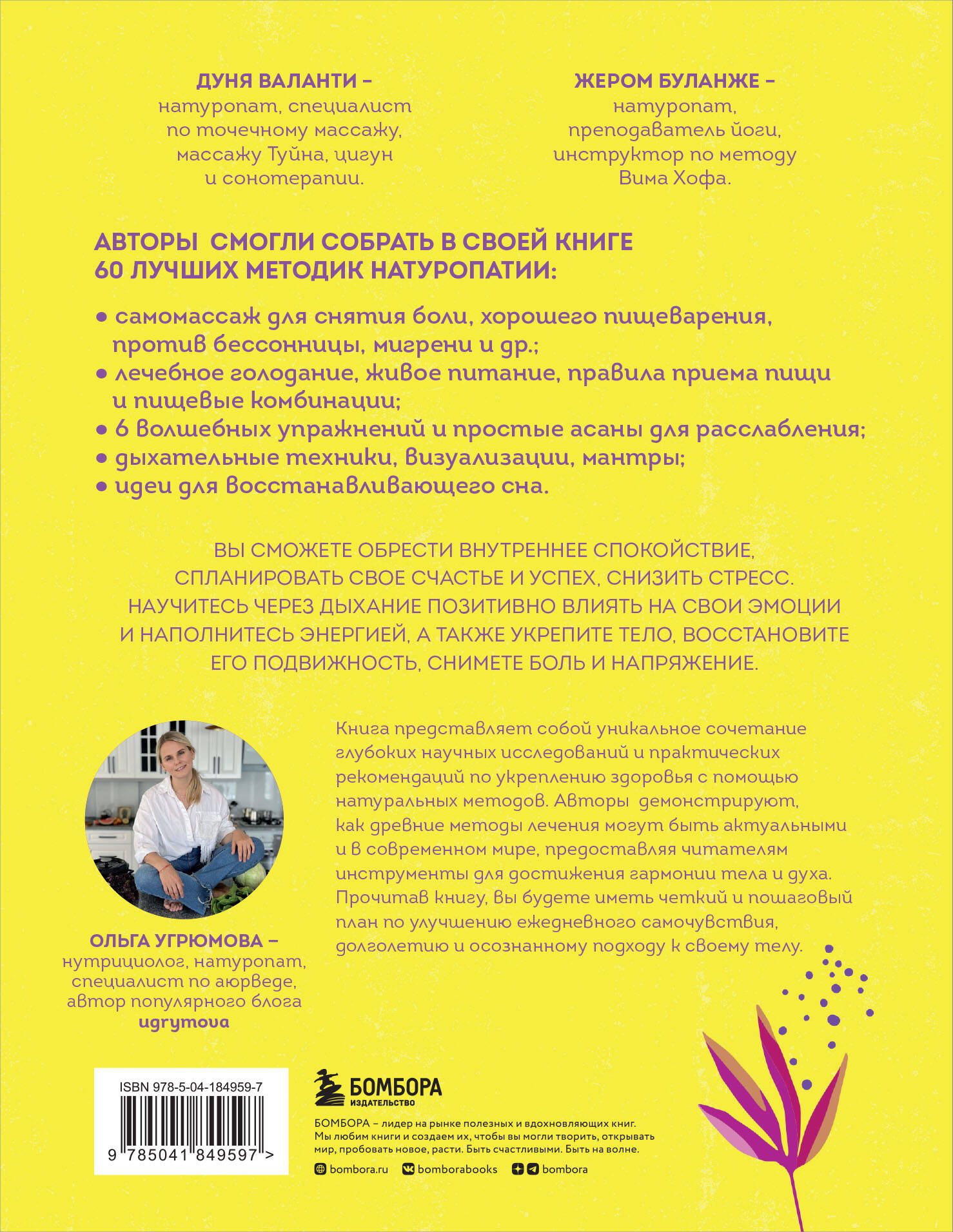 Дуня Валанти - натуропат, специалист по точечному массажу, массажу Туйна, цигун и сонотерапии. Жером Буланже - натуропат, преподаватель йоги, инструктор по методу Вима Хофа. В книге вы найдете большой спектр упражнений и техник, из которых можно выбрать именно те, что отвечают вашим потребностям и целям. Практики не требуют много времени для выполнения, их легко включить в ежедневную рутину. Авторы снабдили все практики понятными пошаговыми инструкциями.| Издательство | ООО "Издательство "Эксмо" |