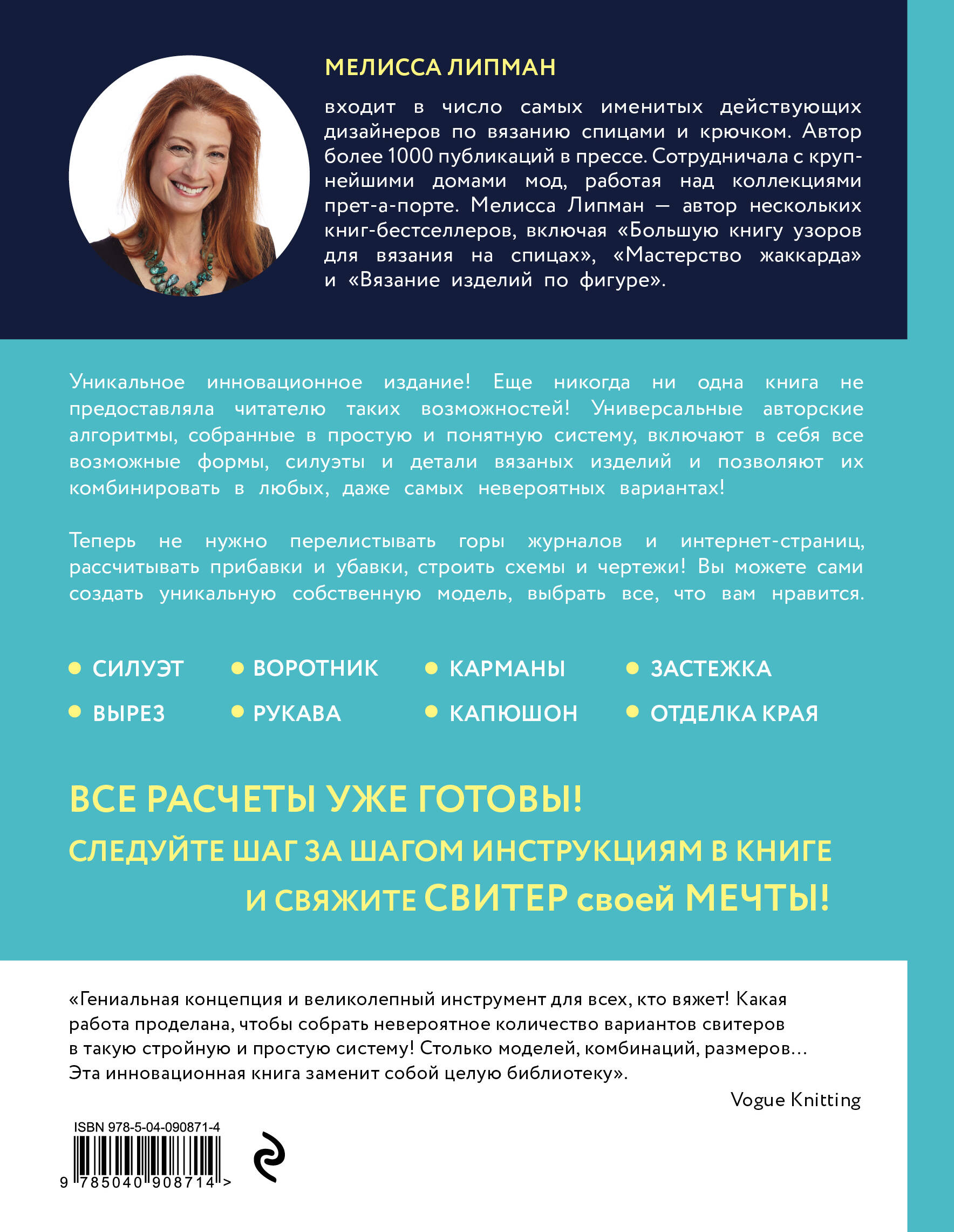 Уникальная система от одного из самых знаменитых авторов в мировом вязании Мелиссы Липман в новой серии книг «Звезды рукоделия. Энциклопедия инноваций»! Теперь вы сможете связать свой свитер мечты, не тратя время и силы на построение выкройки и скучные долгие расчеты. Любой силуэт, любой размер, - просто подставляйте свои данные в таблицу и получайте подробные пошаговые инструкции. Неограниченное количество вариантов рукавов, силуэтов, воротников, капюшонов, вырезов в любых сочетаниях! Создайте собственный дизайн и сразу начинайте вязать! Получайте удовольствие и новую стильную вещь!| Издательство | ООО "Издательство "Эксмо" |