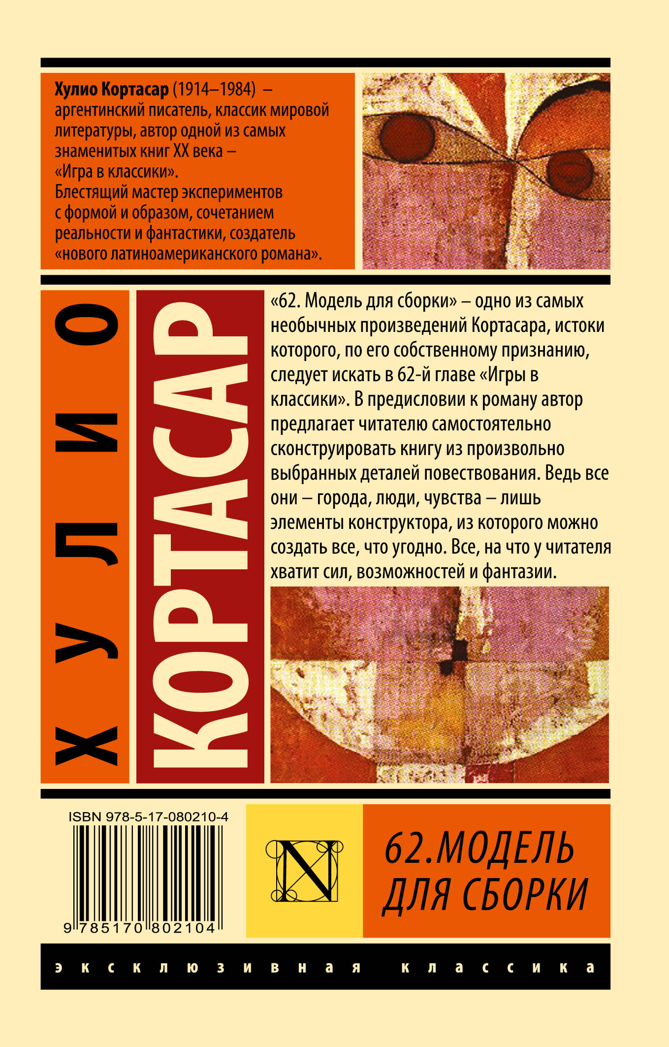 Хулио Кортасар (1914-1984) - аргентинский писатель, классик мировой литературы, автор одной из самых знаменитых книг ХХ века - "Игра в классики". Блестящий мастер экспериментов с формой и образом, сочетанием реальности и фантастики, создатель "нового латиноамериканского романа". "62. Модель для сборки" - одно из самых необычных произведений Кортасара, истоки которого, по его собственному признанию, следует искать в 62-й главе "Игры в классики". В предисловии к роману автор предлагает читателю самостоятельно сконструировать книгу из произвольно выбранных деталей повествования. Ведь все они - города, люди, чувства - лишь элементы конструктора, из которого можно создать все что угодно. Все, на что у читателя хватит сил, возможностей и фантазии.| Издательство | Издательство "АСТ" |