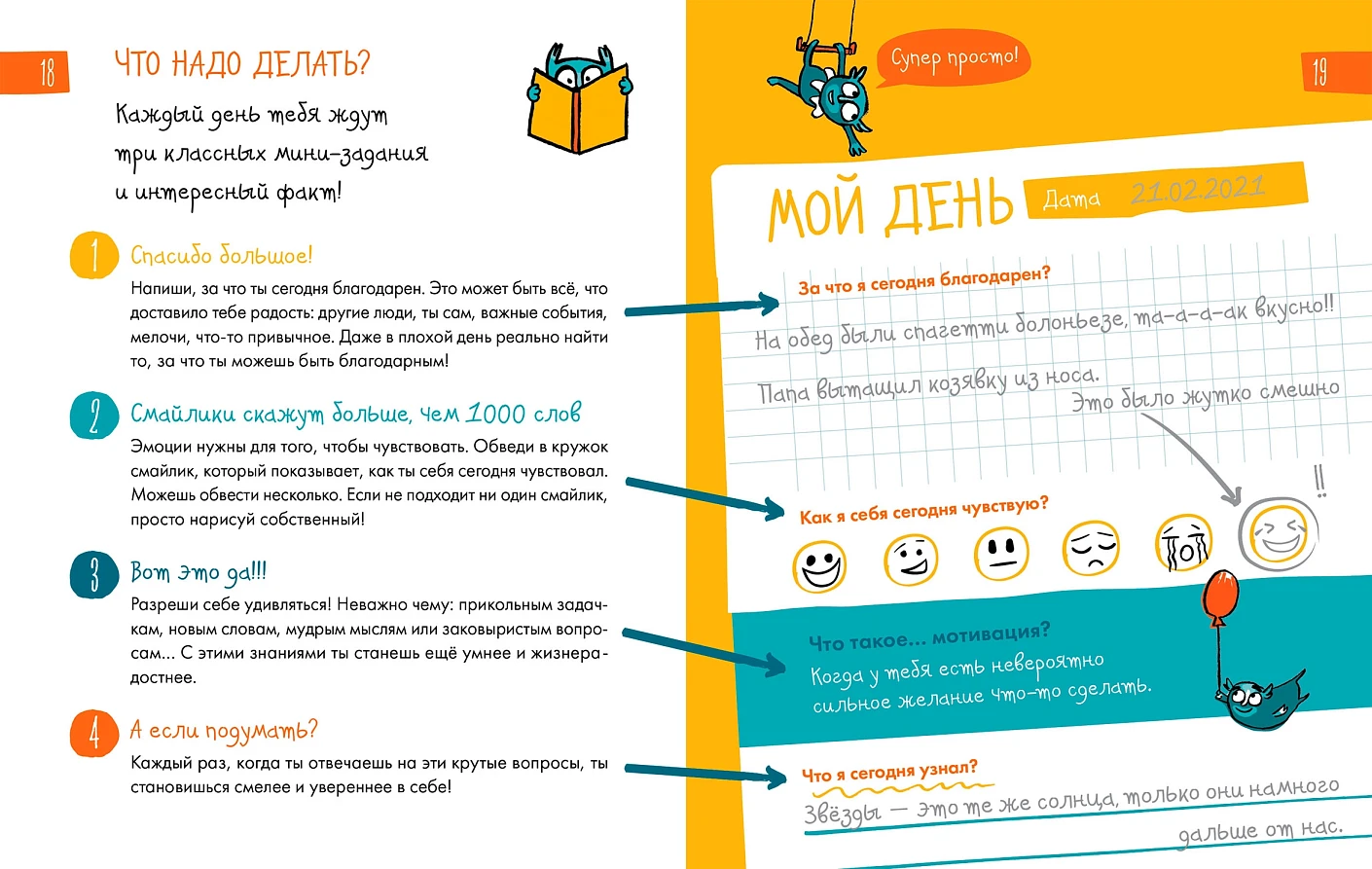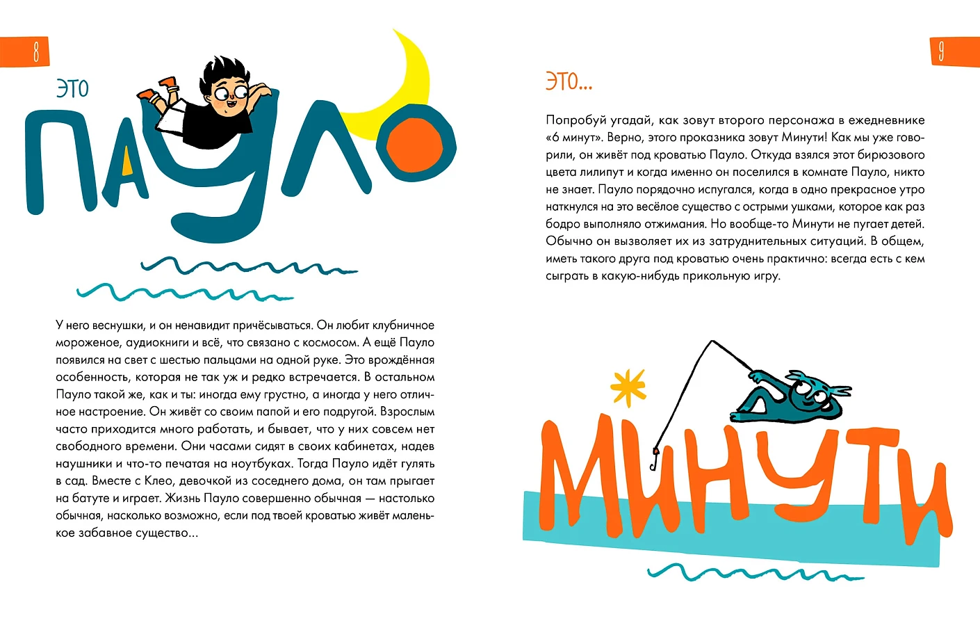 Ежедневник учитывает особенности возрастной психологии детей, поэтому информация подается в игровом формате: заполнение дневниковых записей чередуется с рисованием, ответами на вопросы, интересными фактами и полезной информацией из области психологии. Чтобы ребенку было легче воспринимать материал, на протяжении всего ежедневника его будут сопровождать два героя: мальчик Паоло и его воображаемый друг, проказник Минути.