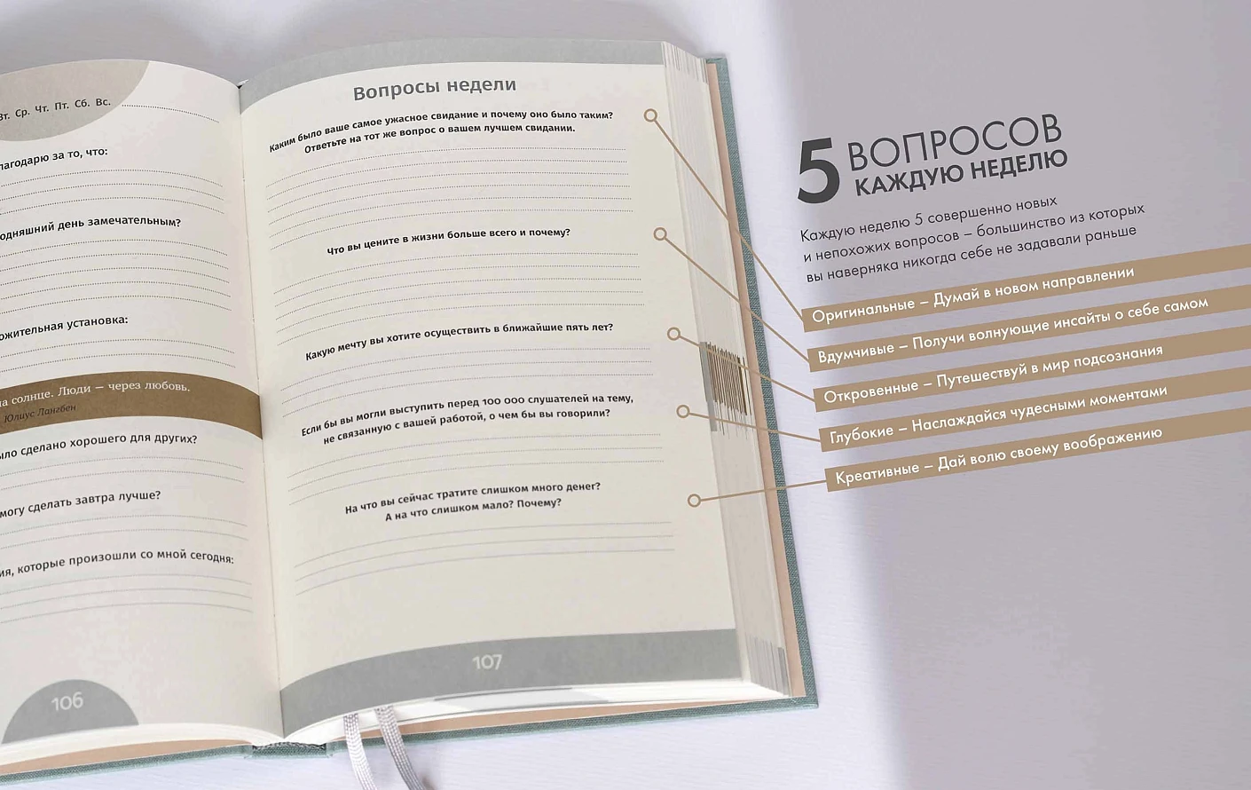 Проверенные на практике принципы позитивной психологии и нейробиологии помогут вам достичь целей, пережить трудные моменты, улучшить отношения с другими людьми и идти по жизни уверенно. С ежедневником вы сможете улучшать свою жизнь постоянно и проактивно, шаг за шагом и каждый день!