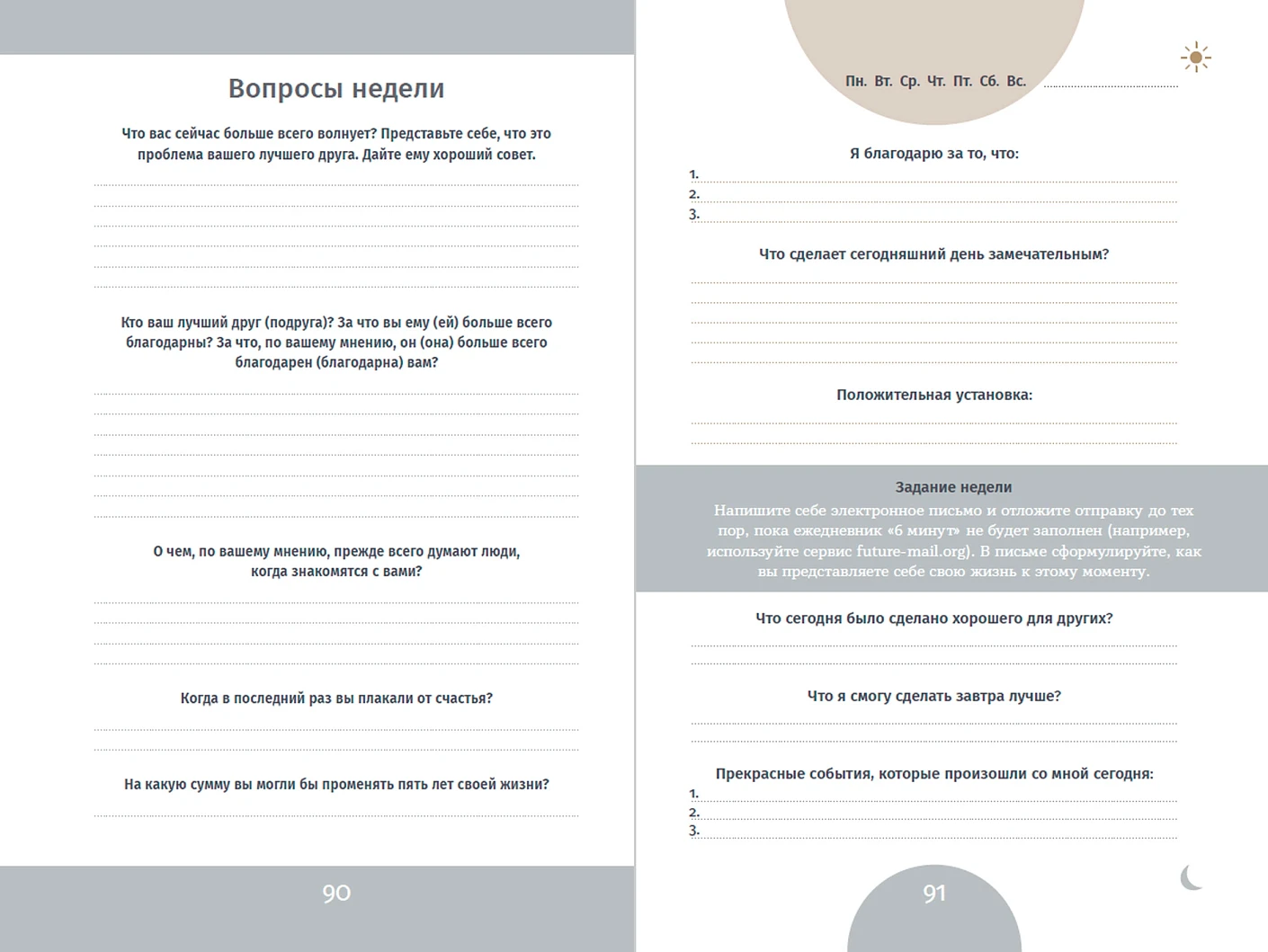 В основе ежедневника лежит простой принцип: обращать внимание нужно не только на то, чего вам не хватает или что плохо работает, а прежде всего на то, что у вас уже есть и что работает хорошо. Таким образом становится заметен позитив, и благодаря этому у вас развиваются конструктивные мысли. Ежедневник поможет вам выработать правильный баланс между оценкой и дальнейшим развитием, между благодарностью и достижением. Он поможет вам научиться по-настоящему ценить Здесь и Сейчас. Вы узнаете, как благодарность делает человека счастливым, и получите ту основу, которая позволит вам ежедневно практиковаться в проявлениях благодарности.