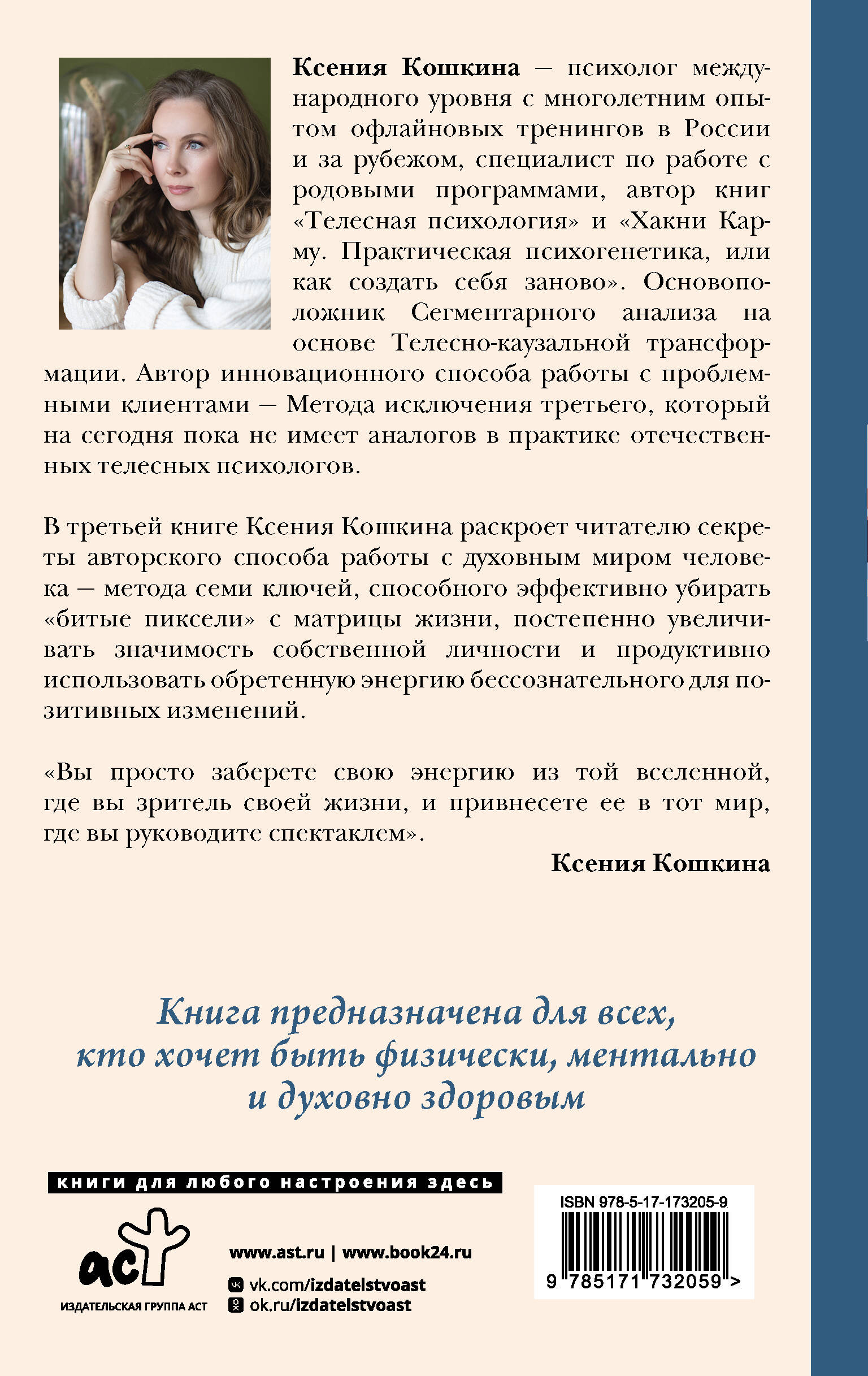 Ксения Кошкина - психолог международного уровня с многолетним опытом офлайновых тренингов в России и за рубежом, специалист по работе с родовыми программами, автор книг "Телесная психология" и "Хакни Карму. Практическая психогенетика, или как создать себя заново". Основоположник Сегментарного анализа на основе Телесно-каузальной трансформации. Автор инновационного способа работы с проблемными клиентами - Метод исключения третьего, который на сегодня пока не имеет аналогов в практике отечественных телесных психологов. В третьей книге Ксения Кошкина раскроет читателю секреты авторского способа работы с духовным миром человека - метода семи ключей, способного эффективно убирать "битые пиксели" с матрицы жизни, постепенно увеличивать значимость собственной личности и продуктивно использовать обретенную энергию бессознательного для позитивных изменений. "Вы просто заберете свою энергию из той вселенной, где вы зритель своей жизни, и привнесете ее в тот мир, где вы руководите спектаклем" - Ксения Кошкина.| Издательство | Издательство "АСТ" |
