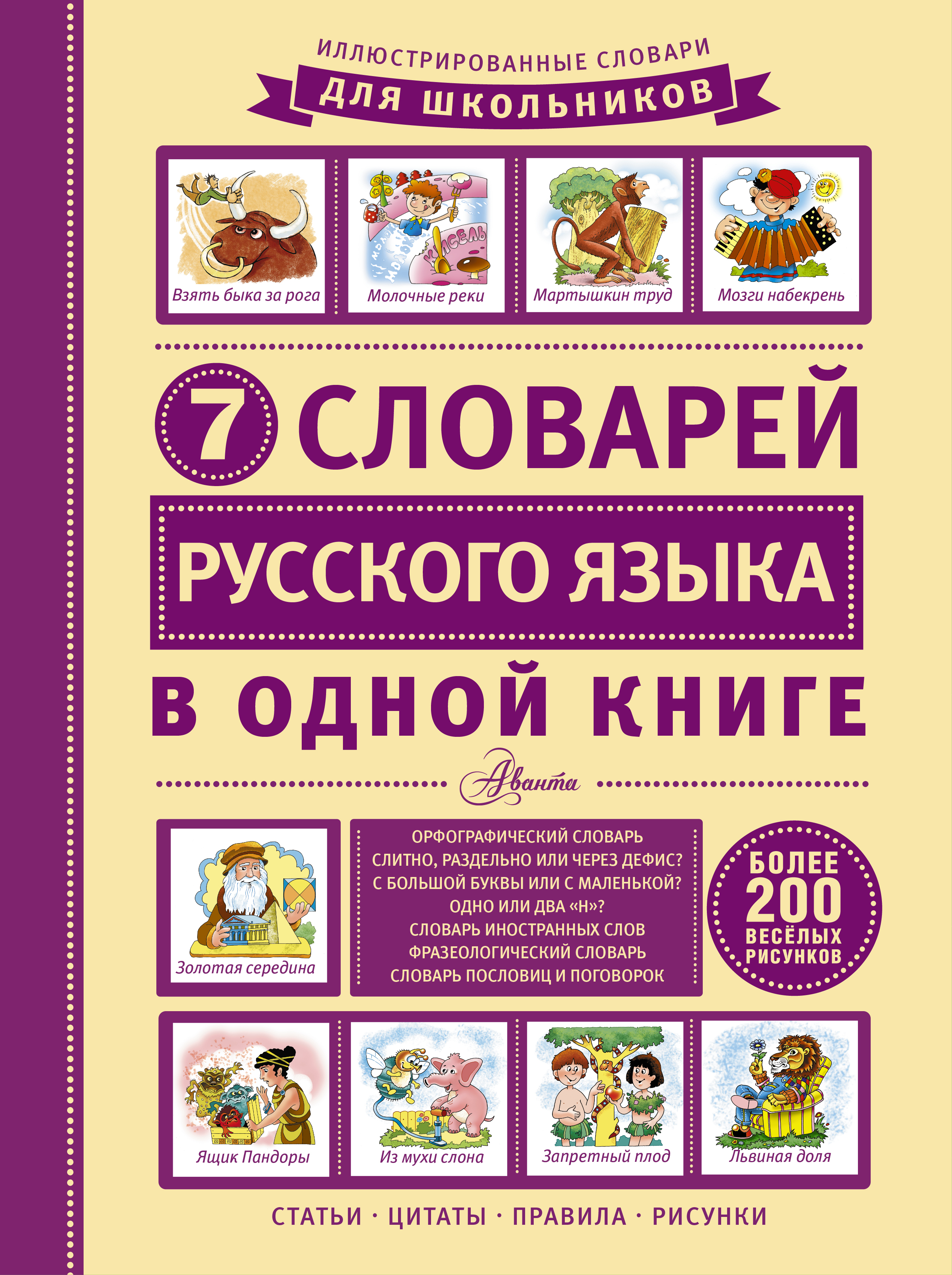 Словарь содержит 7 словарей русского языка для школьников. Книга станет для юных читателей незаменимым помощником и научит грамотно говорить и писать, обогатит его речь новыми словами и выражениями, заложит фундамент для дальнейшей учебы в школе и вузе.| Издательство | Издательство "АСТ" |
