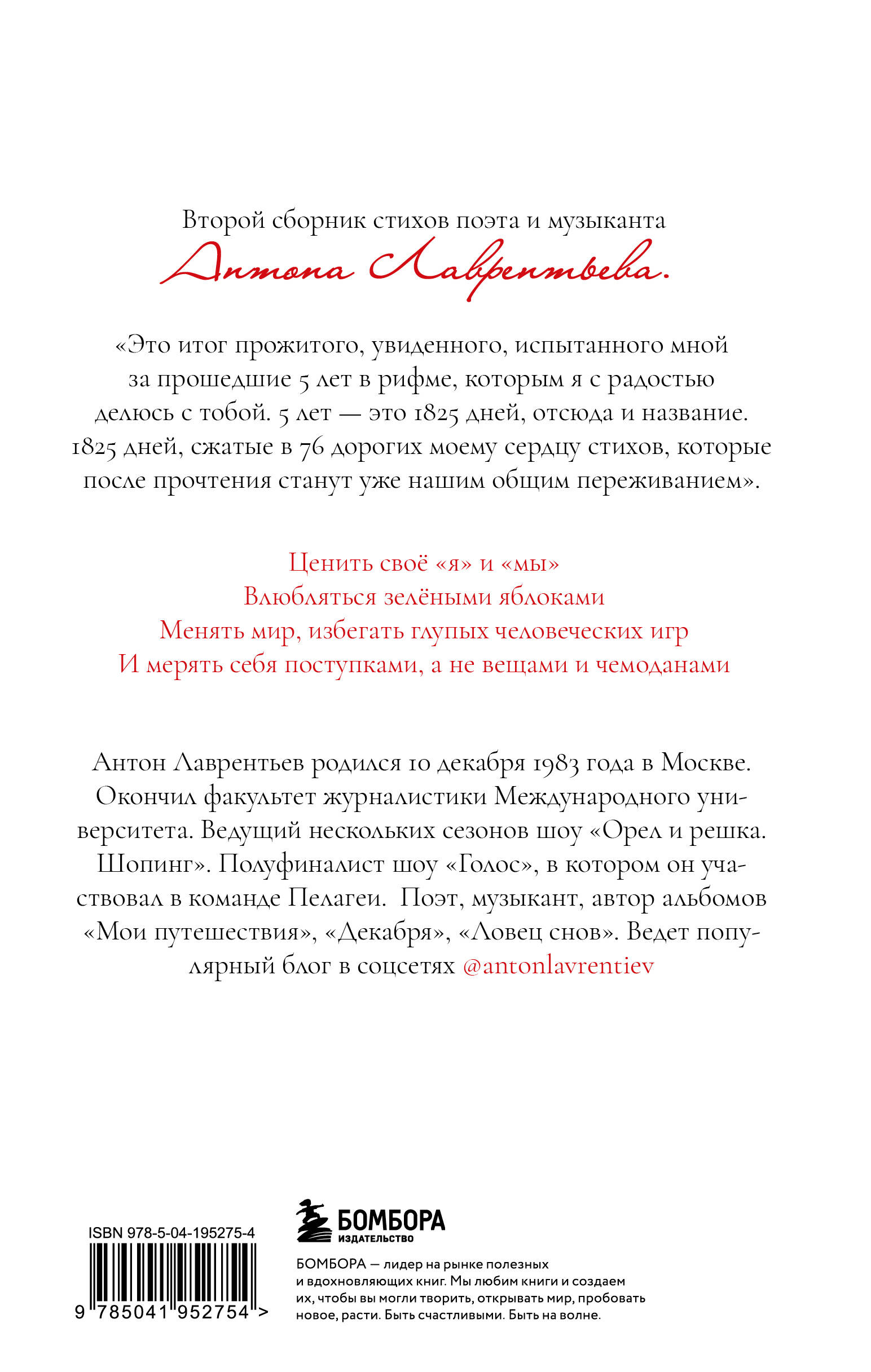«Дорогой читатель! Это мой второй сборник стихов. Как ты мог догадаться, он стал продолжением первого - "Косой Рифмы". Это итог прожитого, увиденного, испытанного мной за прошедшие 5 лет, в рифме, которым я с радостью делюсь с тобой. 5 лет - это 1825 дней, - отсюда и название. 1825 дней, сжатые в 76 дорогих моему сердцу стихов, которые после прочтения станут уже нашим общим переживанием. Обнимаю тебя. Ведь объятия - самый правильный способ согреться». Автор книги Антон Лаврентьев - популярный актер, телеведущий, актер дубляжа и музыкант. Многим он известен благодаря программам «Орел и Решка» и «Голос», а новый сборник стихов Антона раскрывает еще одну грань его таланта перед читателями.| Издательство | ООО "Издательство "Эксмо" |