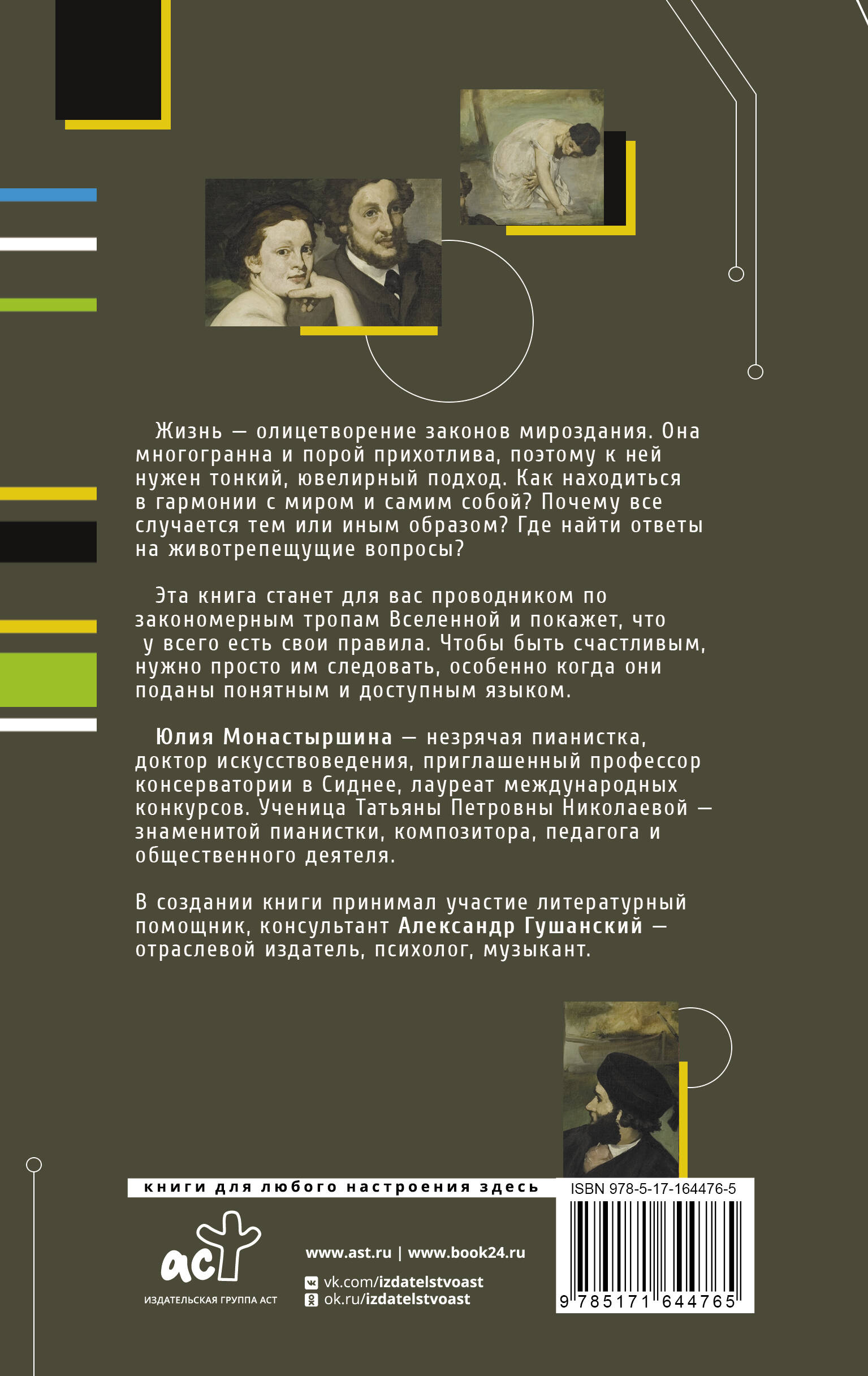Жизнь сложна, многогранна и порой прихотлива. К ней нужен тонкий, ювелирный подход, о котором знают лишь немногие. Как находиться в гармонии с миром и самим собой? Почему все случается тем или иным образом? В чем смысл жизни? Юлия Монастыршина тот человек, который готов ответить на все эти вопросы, насколько бы сложными они не казались. Ее книга «77 законов креативности» станет для вас проводником по закономерным дорогам Вселенной и покажет, что у всего есть свои правила - главное, чтобы быть счастливым, нужно просто им следовать, особенно когда они поданы понятным и доступным языком. Юлия Монастыршина - незрячая пианистка, доктор искусствоведения, приглашенный профессор консерватории в Сиднее, лауреат международных конкурсов. Ученица Татьяны Петровны Николаевой. В создании книги принимал участие литературный помощник, консультант Александр Гушанский - отраслевой издатель, психолог, музыкант.| Издательство | Издательство "АСТ" |