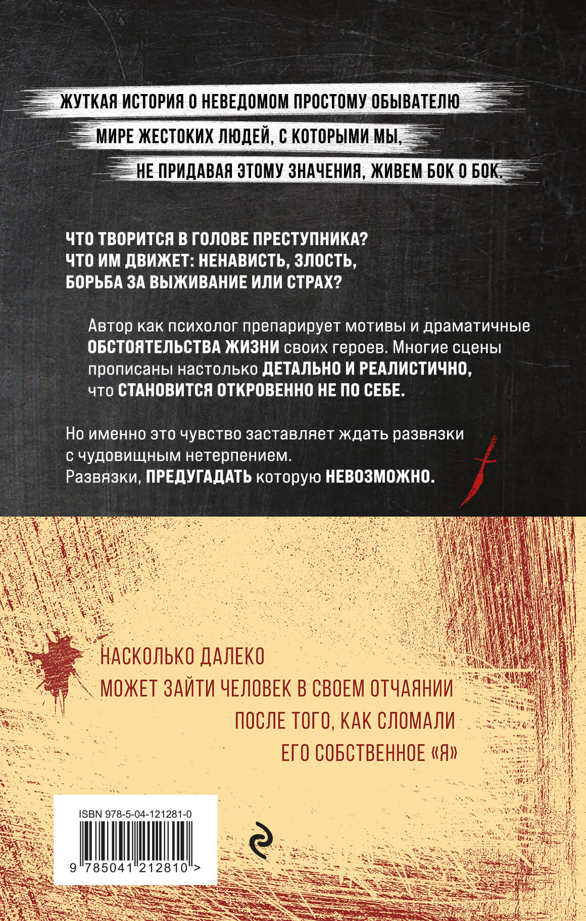 Жуткая история о неведомом простому обывателю мире жестоких людей, с которыми мы, не придавая этому значения, живем бок о бок. Что творится в голове преступника? Что им движет: ненависть, злость, борьба за выживание или страх? Автор как психолог препарирует мотивы и драматичные обстоятельства жизни своих героев. Многие сцены прописаны настолько детально и реалистично, что становится откровенно не по себе. Но именно это чувство заставляет ждать развязки с чудовищным нетерпением. Развязки, предугадать которою невозможно. Матерый уголовник по кличке Токарь планирует ограбить наркоторговцев и выгодно перепродать их товар. Предвкушая удачную аферу, Токарь берет с собой на дело случайную попутчицу красавицу Нину. Операция удается. Но в пылу разборок и любовных утех он не замечает, как сам становится жертвой. Его новая подруга Нина - совсем не та, за кого себя выдает. Токарь с ужасом узнает ее страшную тайну, после чего для него остается только один выход - смерть… «Жесткая, резкая и оглушающая. Юношеские мечты и первая любовь, ошибки молодости и страшные реалии тюремной жизни, попытки не сойти с ума, человеческая сублимация и месть, - ещё ни одна книга так меня не шокировала». - @7_svetik_books «Представьте, что вас на некоторое время поместили в тюремную камеру к самым отчаянным заключённым. Первая мысль: «Что я здесь делаю?», происходящая здесь жестокость возмущает и пугает, а сцены насилия, как и вся развязка этой истории, вас шокируют. Эмоции и множество мыслей, зародившихся тут, навсегда останутся с вами, а дочитав (выйдя из этой камеры), вы уже не останетесь прежним!» - uliana_gushchenko «Безжалостная драма, сюжет которой выпрыгивает как черт из табакерки. Если вы слишком нежная натура, то отложите книгу в сторону, но если вы готовы к погружению в пучину мрака, то знайте - захочется ещё». - @hah.books| Издательство | ООО "Издательство "Эксмо" |