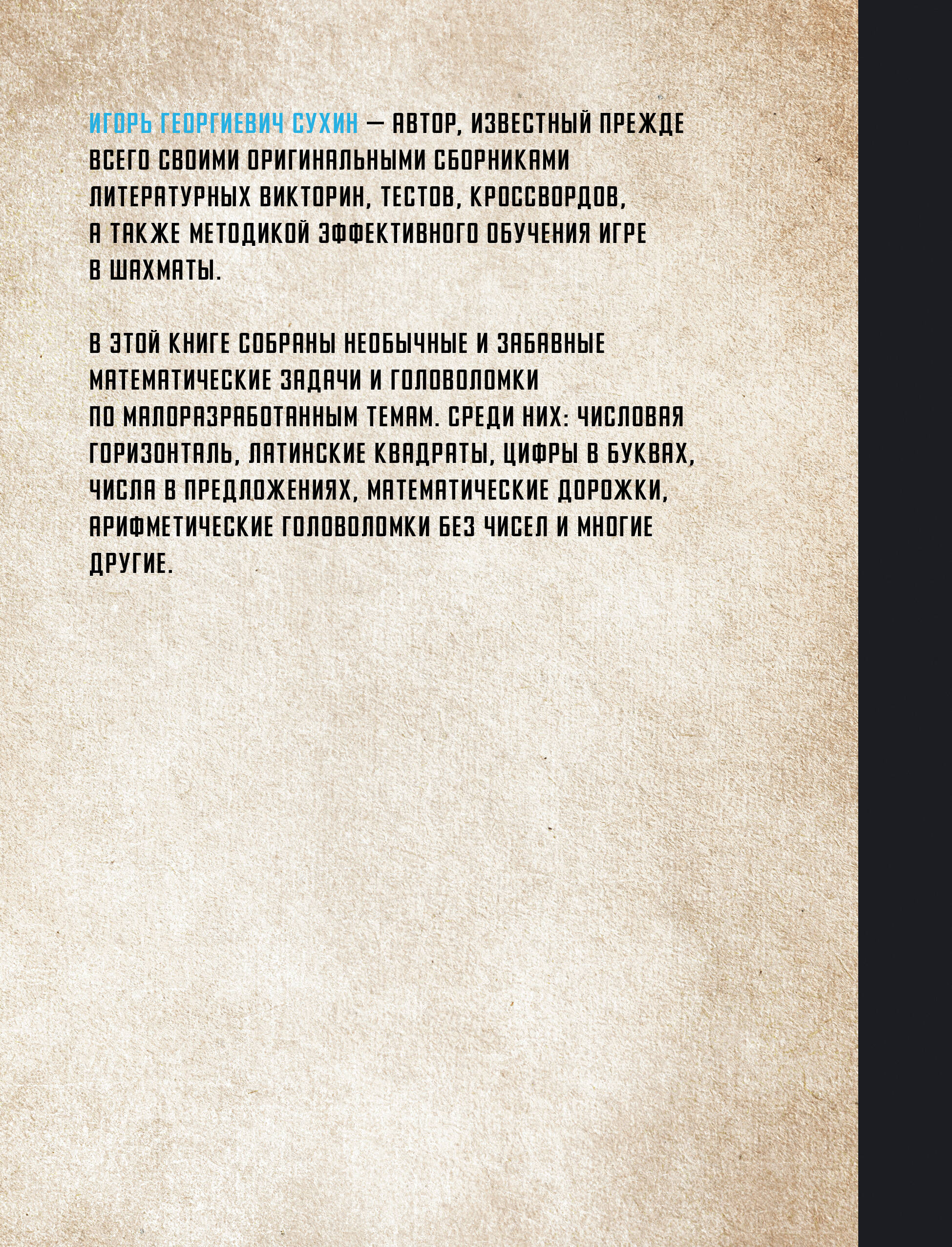 Игорь Георгиевич Сухин - автор, известный прежде всего своими оригинальными сборниками литературных викторин, тестов, кроссвордов, а также методикой эффективного обучения игре в шахматы. В этой книге собраны необычные и забавные математические задачи и головоломки по малоразработанным темам. Среди них: числовая горизонталь, латинские квадраты, цифры в буквах, числа в предложениях, математические дорожки, арифметические головоломки без чисел и многие другие.| Издательство | ИЗДАТЕЛЬСТВО "АСТ" |