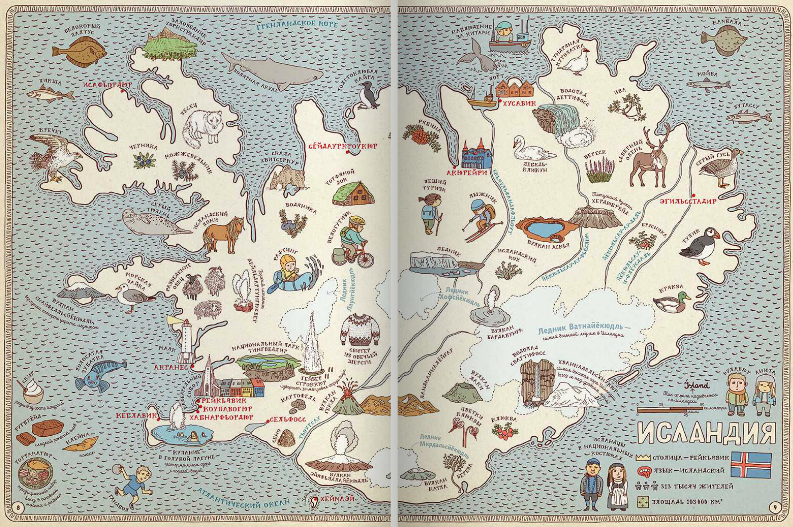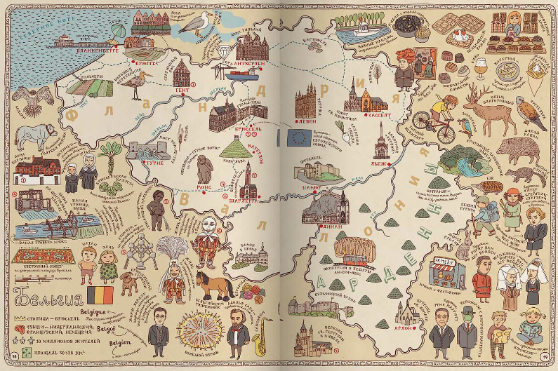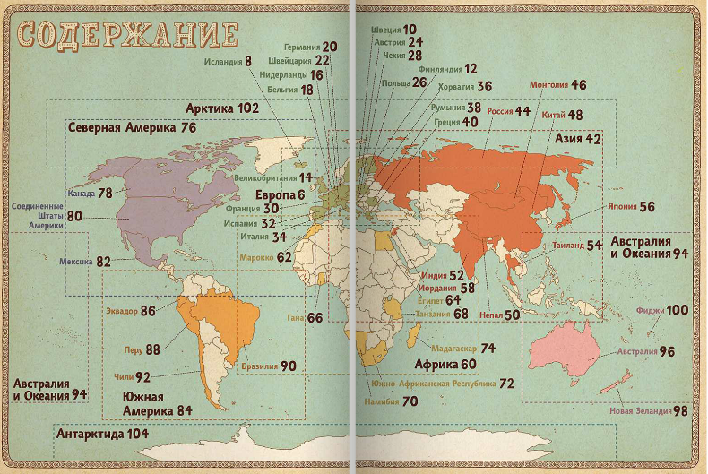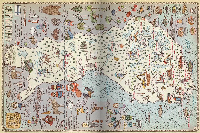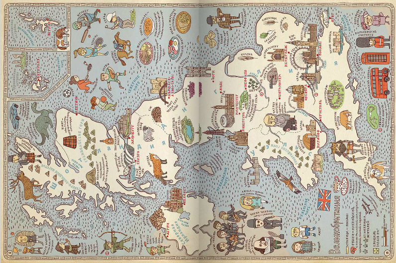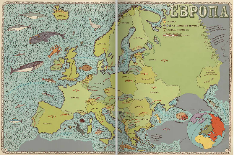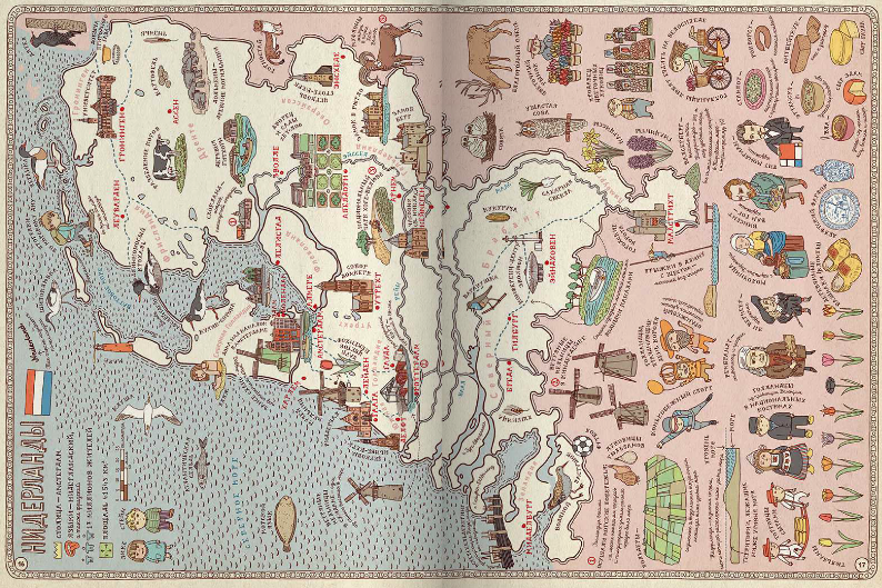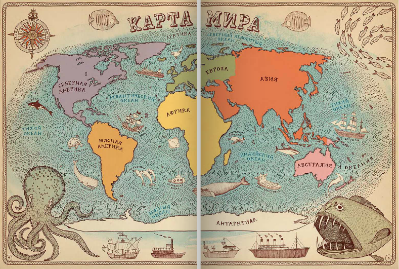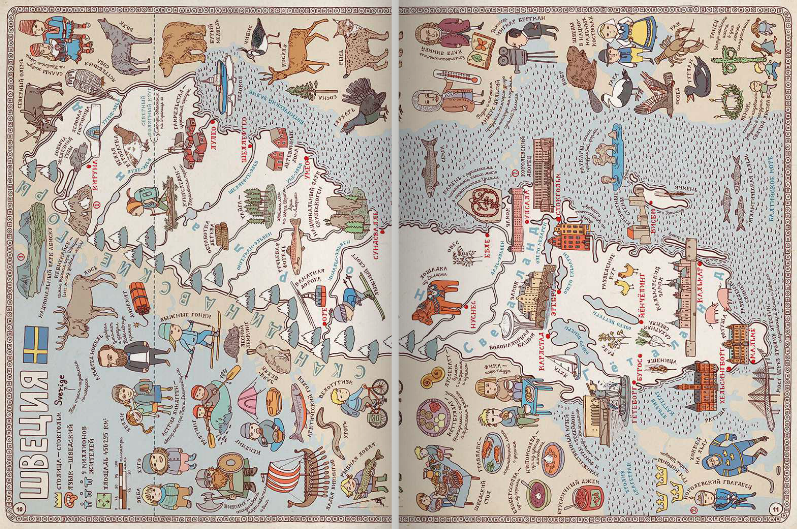 Географическая карта может быть скучным школьным пособием, а может стать и игрой, развивающей воображение, тренирующей память и позволяющей овладевать новыми знаниями. Рисованный атлас «Карты» польских художников Александры и Даниэля Мизелиньских можно уподобить старинным картам мира, на которых картографы помещали много полезных сведений о странах и людях, в них живущих. И с его помощью художники приглашают нас в необычное путешествие вокруг света, которое можно совершить из дома.
