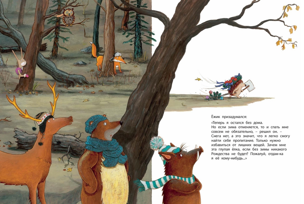 Если зима не наступает, то Рождества не будет, решили лесные звери, не дождавшись в декабре ни снега, ни морозов. Да и зимние вещи, пожалуй, не нужны. И звери нашли им лучшее применение, соорудив из саней качели, из хоккейного шлема - лодочку, из печки - водолазную маску… Так вместо встречи Нового года они полностью подготовились к новому пляжному сезону. Вот тут-то и пошёл снег...