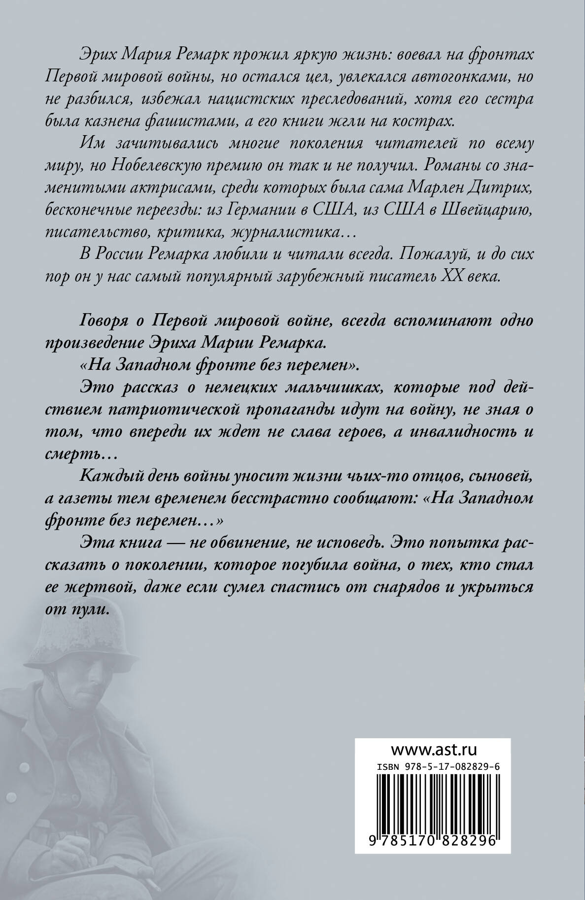 Говоря о Первой мировой войне, всегда вспоминают одно произведение Эриха Марии Ремарка. "На Западном фронте без перемен". Это рассказ о немецких мальчишках, которые под действием патриотической пропаганды идут на войну, не зная о том, что впереди их ждет не слава героев, а инвалидность и смерть… Каждый день войны уносит жизни чьих-то отцов, сыновей, а газеты тем временем бесстрастно сообщают: "На Западном фронте без перемен..." Эта книга - не обвинение, не исповедь. Это попытка рассказать о поколении, которое погубила война, о тех, кто стал ее жертвой, даже если сумел спастись от снарядов и укрыться от пули.| Издательство | ИЗДАТЕЛЬСТВО "АСТ" |