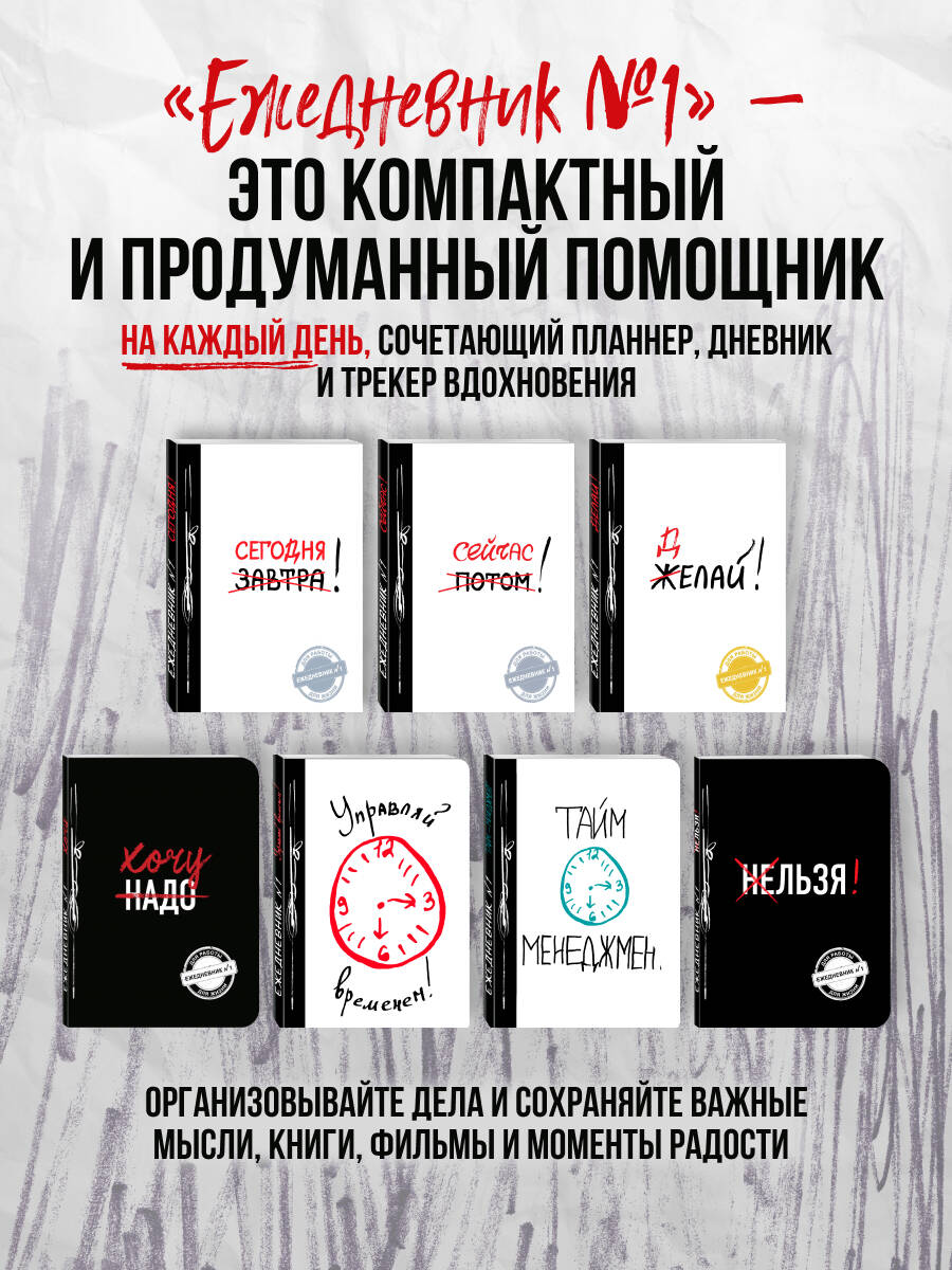 Ежедневник № 1 «Делай!» - это проект с уникальным контентом. Невероятно продуманный и удобный ежедневник, планнер и дневник в одном компактном блокноте, который удобно носить с собой. С ним вы сможете эффективно составлять ваши планы и записывать нужную информацию. На каждый календарный день предусмотрено место для записи внезапно посетивших важных идей, для планов на ночь и для списка поощрений себя за проделанную работу. Вам порекомендовали хороший фильм, вы услышали новую песню по радио со сложным названием или нужно составить список для похода в любимый книжный? Ежедневник поможет фиксировать каждый день названия книг, песен или фильмов. Ежедневник с уникальным методом записи информации поможет каждому ощущать в жизни гармонию и баланс, когда все самое важное интересно спланировано.| Издательство | Эксмо |