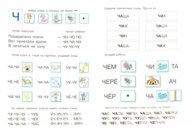 Первые книги по чтению. Короткие слова в один-два слога. Найди букву. Ребусы. Словесные переменки
