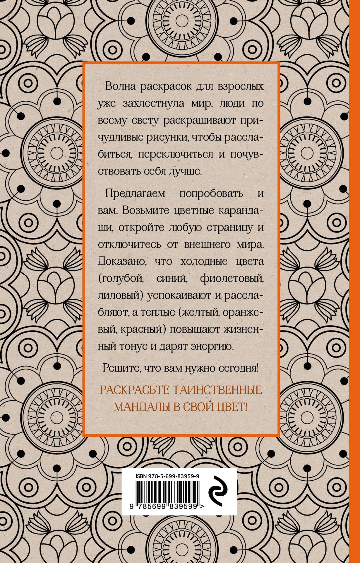 О чем эта книга Новая серия «Арт-терапия» - это множество причудливых узоров и фантастических рисунков, которые подарят вам спокойствие и умиротворение и помогут избавиться от стресса. Возьмите цветные карандаши или ручки и полностью отключитесь от внешнего мира, раскрашивая таинственные мандалы, и через некоторое время вы вернетесь уже полностью обновленным человеком. Используйте холодные цвета (голубой, синий, фиолетовый), если хотите расслабиться. И теплые (красный, оранжевый, желтый), если хотите ощутить прилив сил и энергии. Решите, что необходимо вам сегодня. Медитативные раскраски для взрослых уже получили популярность и признание во всем мире, а теперь они пришли в Россию. Предлагаем попробовать и вам ощутить удивительное воздействие арт-терапии. Для кого эта книга Для тех, кто хочет отдохнуть после тяжелого дня и расслабиться. Для тех, кто мечтает раскрасить мир в свои цвета! Как работать с книгой Удобнее всего использовать акварельные карандаши: они ярче обычных и не размазываются по бумаге. Для мелких узоров советуем взять цветные гелевые ручки. Фишки книги Мировой бестселлер. Самая популярная в мире серия раскрасок для взрослых из Франции!| Издательство | ООО "Издательство "Эксмо" |