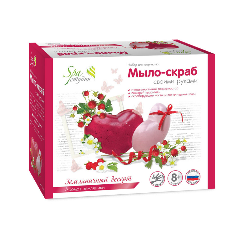 С помощью данного набора дети смогу создать своими руками настоящее мыло-скраб. Им предстоит провести настоящие эксперименты, смешивая ингредиенты между собой. Получившийся в итоге кусочек мыла, с ароматным земляничным запахом, готов к применению. Он сделает кожу нежной и шелковистой, благодаря скрабирующим частицам, прекрасно очищающим и устраняющим все неровности кожи. Умываться мылом собственного производства - одно удовольствие!