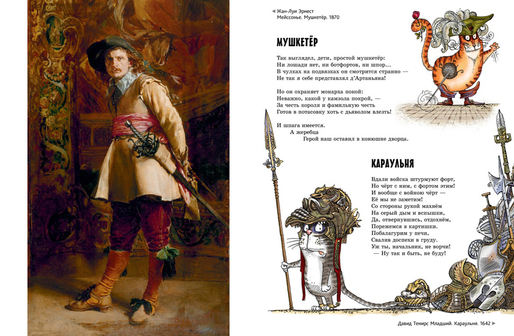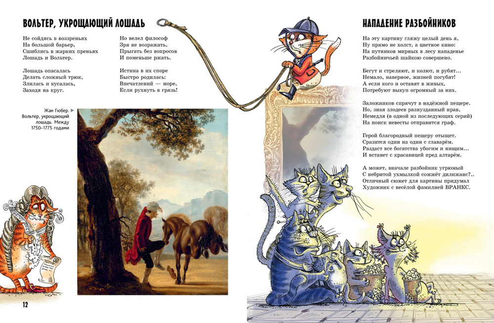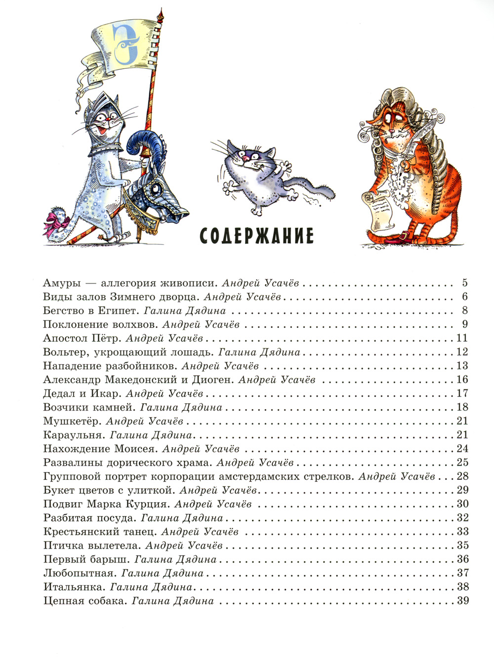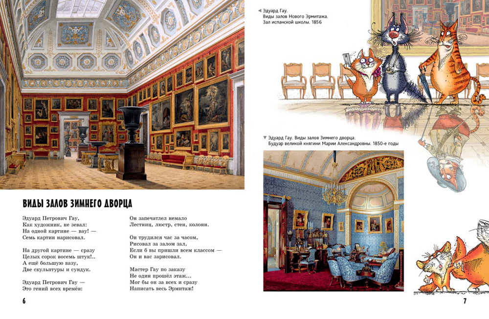 Представьте себе: вы гуляете по роскошному дворцу. Кругом мебель, обитая бархатом, старинные картины в золочёных рамах… А навстречу вам то и дело попадается кто-нибудь очень необычный: то настоящий мушкетёр, то пара оборванных цыганских детишек, а то и сам Александр Македонский! Думаете, такое возможно только во сне? А вот и нет - подобное запросто может произойти, если вам вздумается прогуляться по Эрмитажу. И уж если вашим экскурсоводом вызвался стать сам профессор АУ, прогулка обещает быть чрезвычайно увлекательной и по-настоящему захватывающей! Профессор с удовольствием поведает вам множество стихотворных историй о картинах и их создателях, а сопровождать вас будут знаменитые на весь мир эрмитажные коты, которых изобразила замечательная художница Елена Гозман.| Издательство | Азбука |