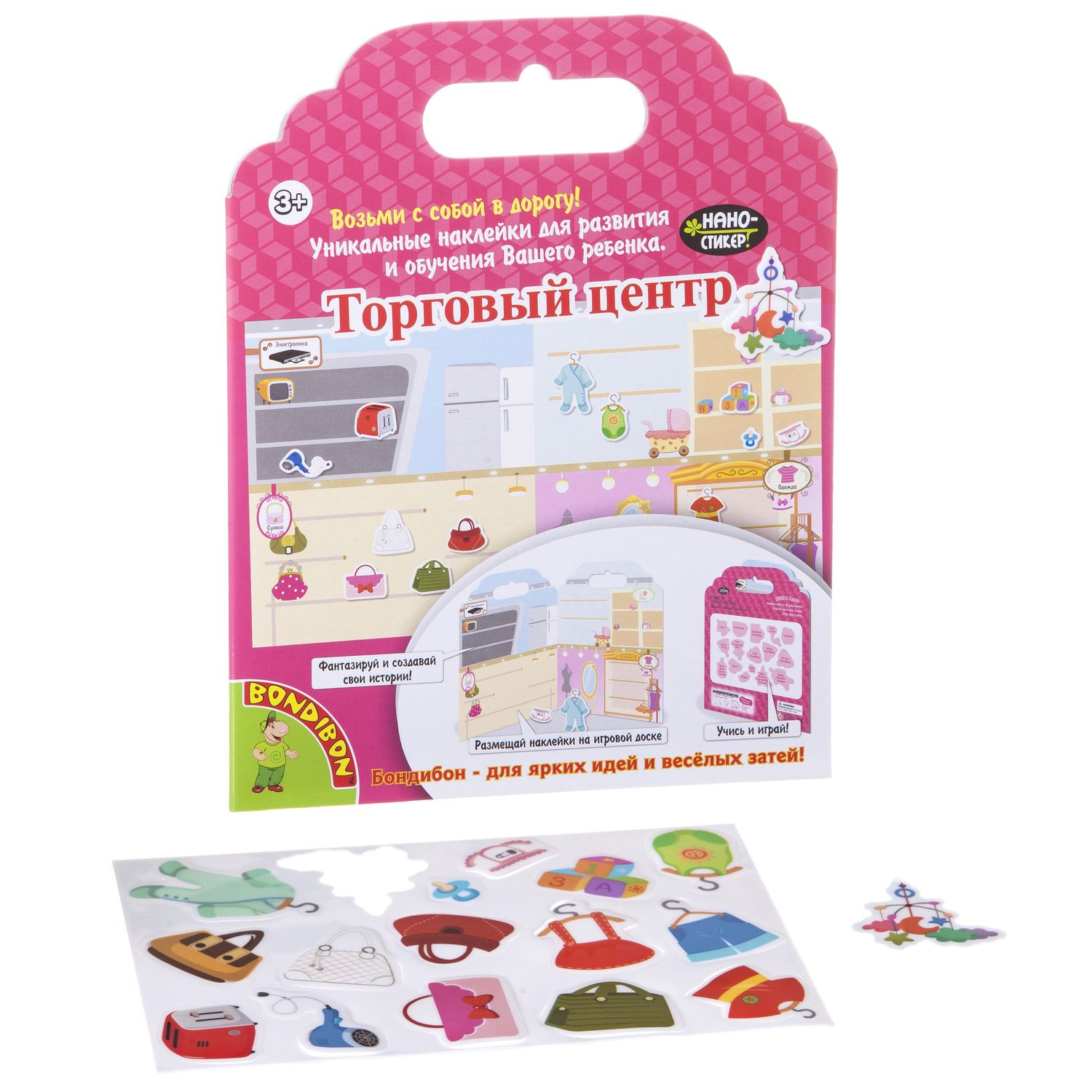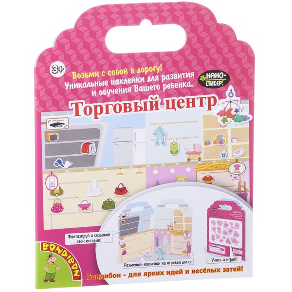 Набор наклеек "Торговый центр" из серии "Нано-Стикер" - необычная игра для девочек. Позволит интересно и необычно провести время в дороге или дальней поездке. Яркие нано-стикеры из набора, представляющие разную тематику, способны приклеиваться к любой твердой поверхности без применения клея или магнита. С помощью наклеек и игрового поля ребенок может разыграть разные сюжеты и весело провести время.