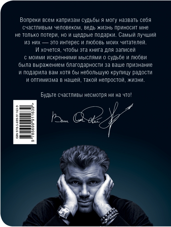 Вопреки всем капризам судьбы я могу назвать себя счастливым человеком, ведь жизнь приносит мне не только потери, но и щедрые подарки. Самый лучший из них - это интерес и любовь моих читателей. И хочется, чтобы эта книга для записей с моими искренними мыслями о судьбе и любви была выражением благодарности за ваше признание и подарила вам хотя бы небольшую крупицу радости и оптимизма в нашей, такой непростой, жизни.