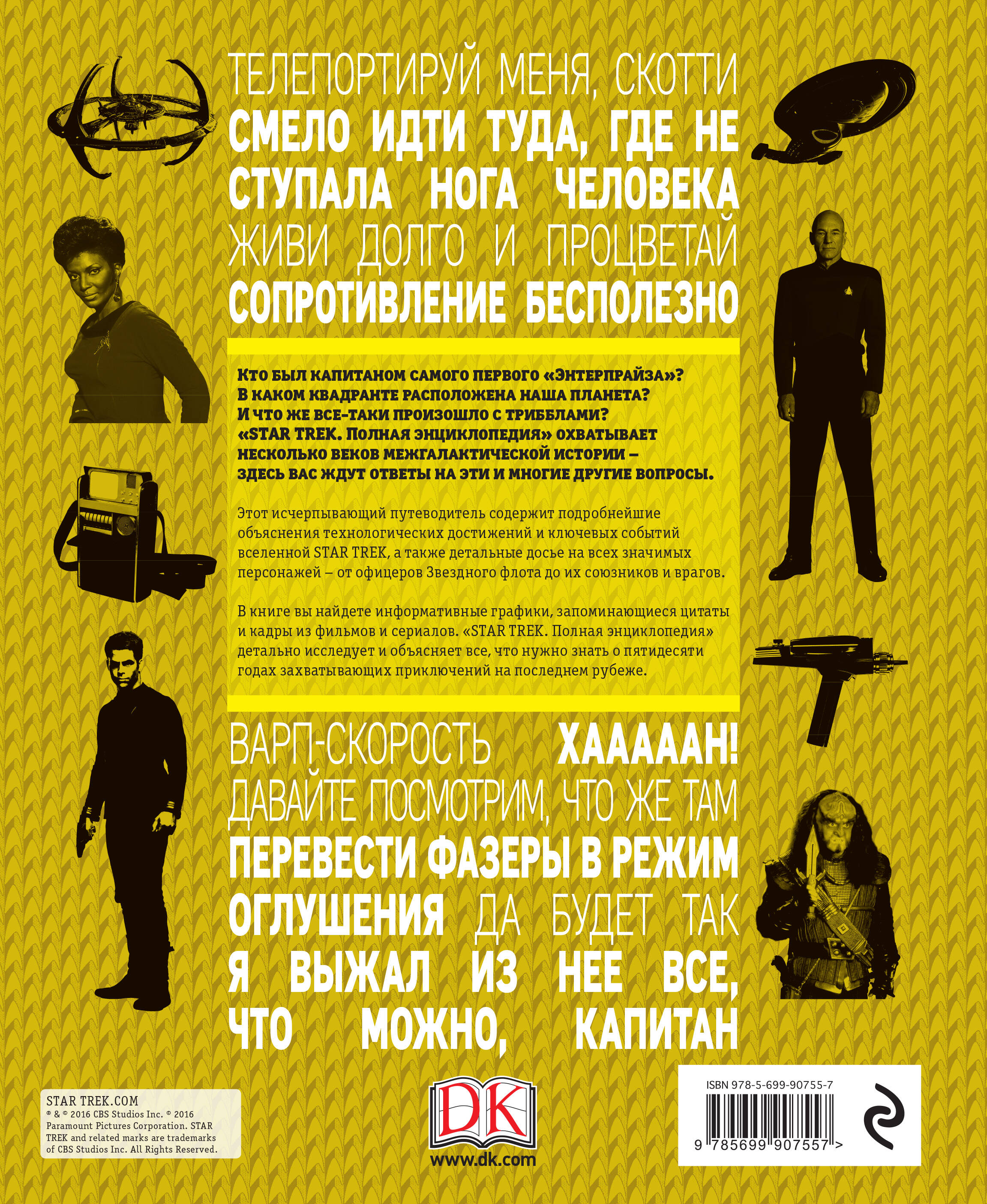 Этот исчерпывающий путеводитель содержит подробнейшие объяснения технологических достижений и ключевых событий вселенной Star Trek, а также детальные досье на всех значимых персонажей - от офицеров Звездного флота до их союзников и врагов. В книге вы найдете информативные графики, запоминающиеся цитаты и кадры из фильмов и сериалов. «STAR TREK. Полная энциклопедия» детально исследует и объясняет все, что нужно знать о пятидесяти годах захватывающих приключений на последнем рубеже.| Издательство | ООО "Издательство "Эксмо" |