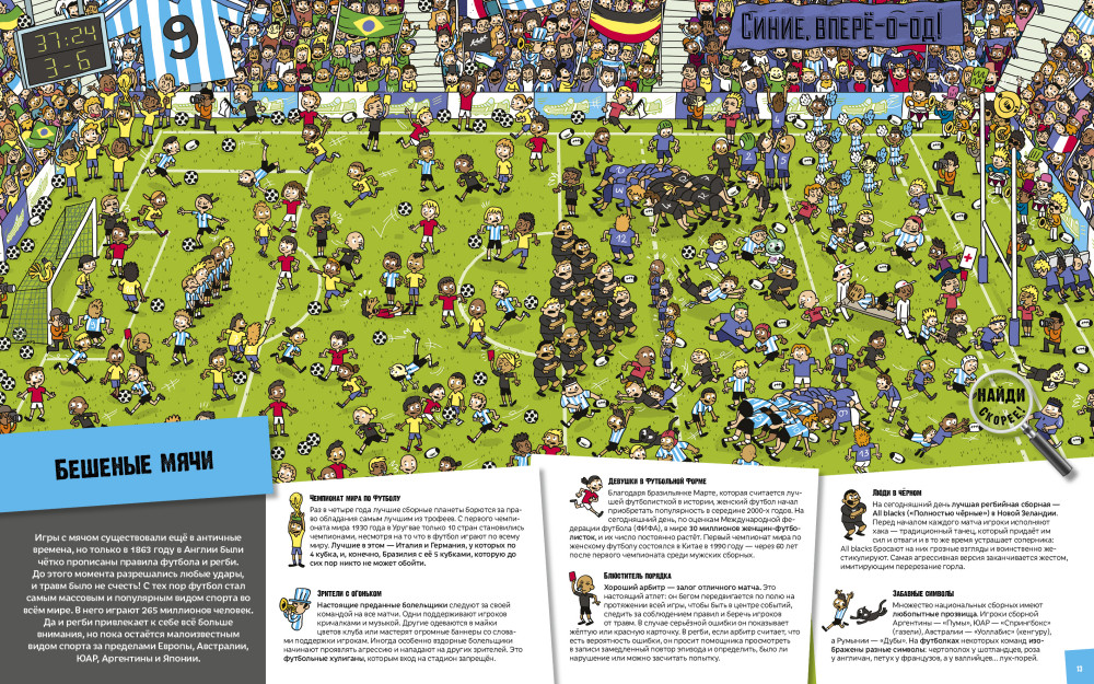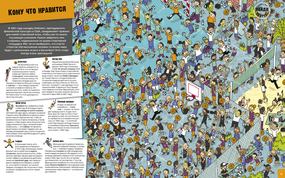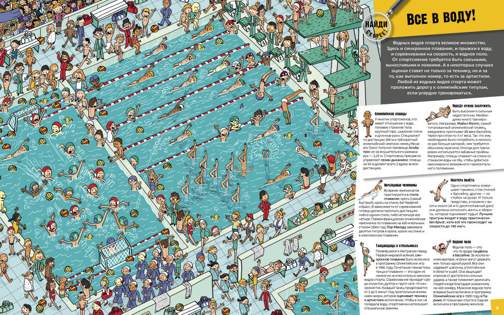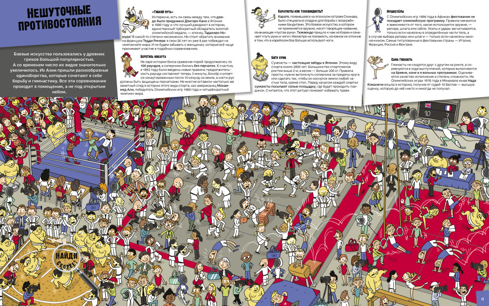В этой книге вы сможете увидеть самых разных спортсменов. Ваша задача - найти их в толпе. А ещё на каждом развороте вы встретите любопытного зайчика, который очень ловко прячется. На старт, внимание, вперёд, на поиски!