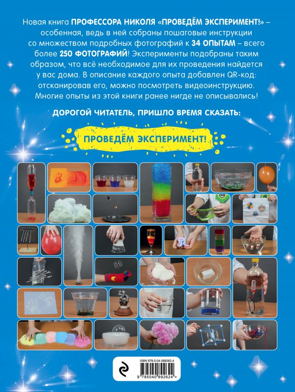 Новая книга профессора Николя "Проведем эксперимент!" - особенная, ведь в ней собраны пошаговые инструкции со множеством подробных фотографий к 34 опытам - всего более 250 фотографий! Эксперименты подобраны таким образом, что все необходимое для их проведения найдется у вас дома. В описание каждого опыта добавлен QR-код: отсканировав его, можно посмотреть видеоинструкцию. Многие опыты из этой книги ранее нигде не описывались!