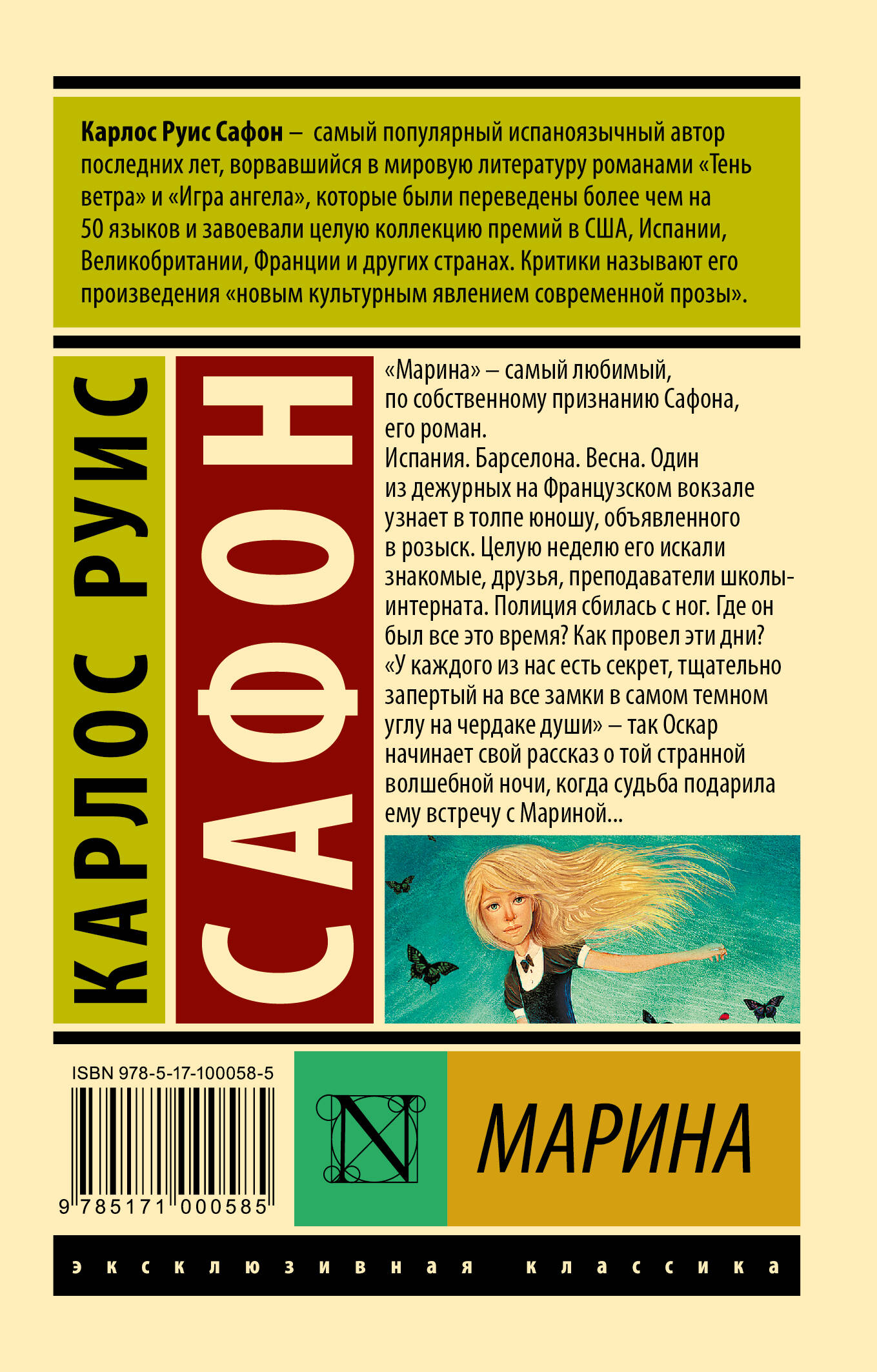 "Марина" - самый любимый, по собственному признанию Сафона, его роман. Испания. Барселона. Весна. Один из дежурных на Французском вокзале узнает в толпе юношу, объявленного в розыск. Целую неделю его искали знакомые, друзья, преподаватели школы-интерната. Полиция сбилась с ног. Где он был все это время? Как провел эти дни? "У каждого из нас есть секрет, тщательно запертый на все замки в самом темном углу на чердаке души" - так Оскар начинает свой рассказ о той странной волшебной ночи, когда судьба подарила ему встречу с Мариной.| Издательство | ИЗДАТЕЛЬСТВО "АСТ" |