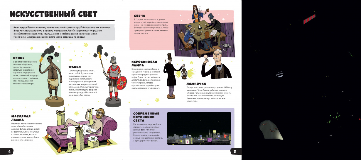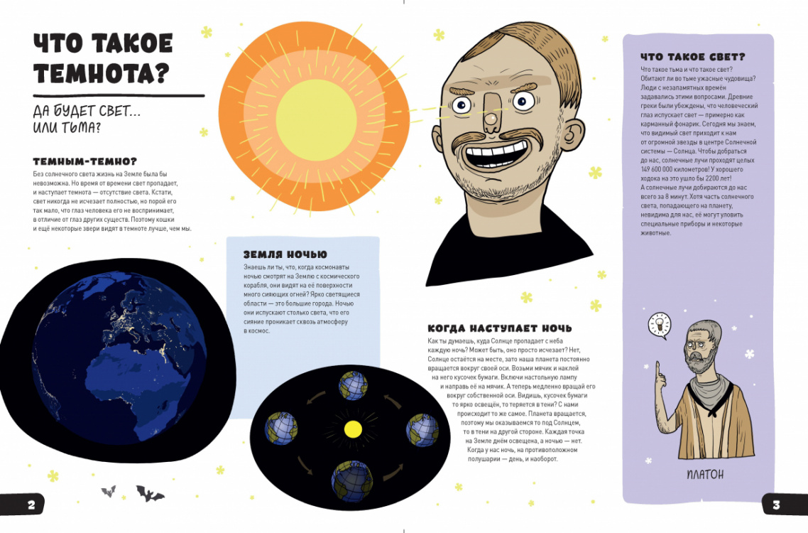 Во что поиграть, когда в гости пришли друзья? Проведите веселую викторину, используя факты из этой книги. Сколько времени нужно солнечному свету, чтобы добраться до нашей планеты? Когда появились первые керосиновые лампы? Почему растения растут ночью? Такие вопросы заинтересуют даже родителей. Развивайте кругозор ребенка в процессе игры.