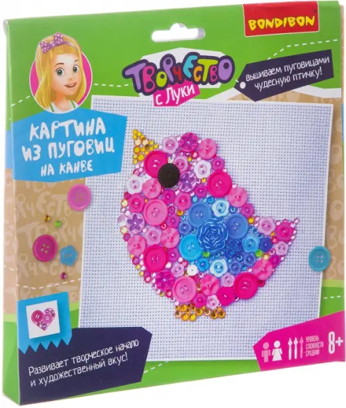 Пуговицы - интересный и необычный материал для занятий с ребёнком. Из них можно делать различные мозаики, панно, фигурки и это только краткий список. Разнообразные цвета и формы надолго займут малыша. В новом наборе bondibon предлагает совместить вышивание и создание мозаики из пуговиц, объединив положительные стороны обоих занятий. Ребёнок в игровой форме разовьёт творческое начало и художественный вкус.