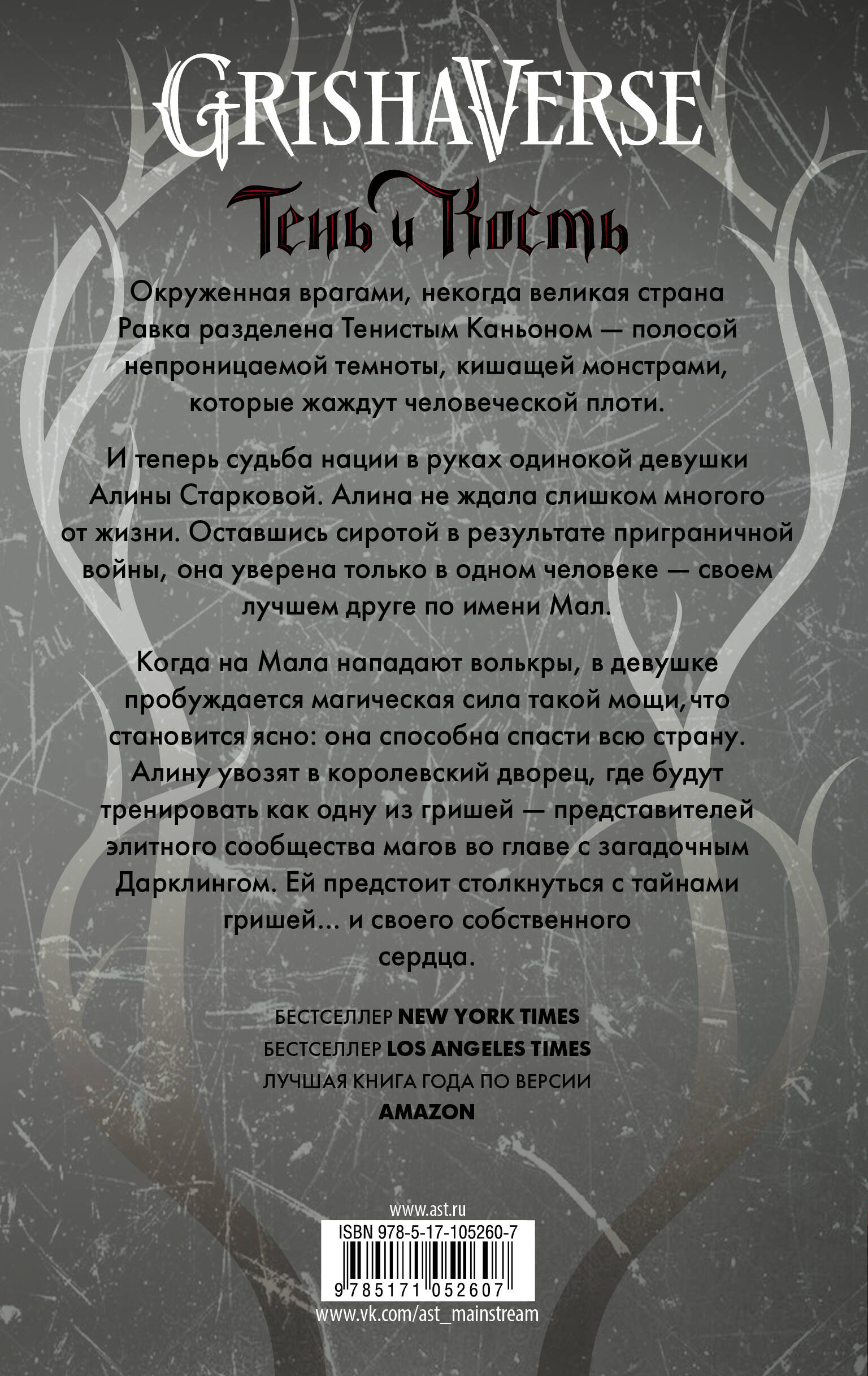 «Тень и кость» - дебютный роман Ли Бардуго, автора бестселлеров «Шестерка воронов» и «Продажное королевство». Книга, с которой началась история гришéй - людей с магическими способностями. Алина Старкова - семнадцатилетняя девушка-сирота, которую отправили на войну в приграничную зону. Она знает, что, возможно, не переживет свой первый бой. Но дороже жизни ей Мал - ее единственный друг, которого она боится потерять. Когда на них нападают волькры - монстры, враждебные порождения тьмы, - Алина неожиданно открывает в себе силу, о которой не подозревала. Магия Алины так сильна, что становится ясно: она способна спасти всю страну. Алину увозят в королевский дворец, где будут тренировать как одну из гришей - представителей элитного сообщества магов во главе с загадочным Дарклингом. Ей предстоит столкнуться с тайнами гришей… и своего собственного сердца. Книга вошла в список бестселлеров New York Times и Los Angeles Times; права на ее экранизацию приобрел продюсер Дэвид Хейман - человек, благодаря которому увидели свет фильмы о Гарри Поттере. Роман был переведен на 22 языка. Впервые на русском!| Издательство | ИЗДАТЕЛЬСТВО "АСТ" |