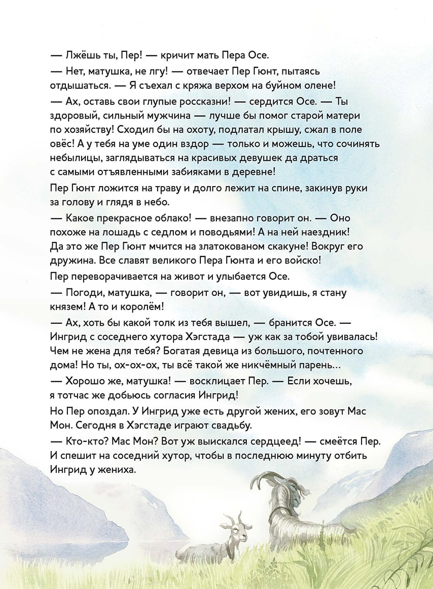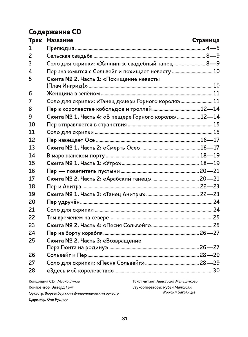 Чарующие звуки музыки и сказочный мир на страницах детских книг! Представляем коллекцию, которая не оставит равнодушным ни одного взрослого или юного читателя! В книгах этой серии вас ждет уникальное сочетание: либретто известнейших шедевров мировой музыкальной классики, адаптированные для детей дошкольного и младшего школьного возраста, дополненные диском с мелодиями из самих произведений и интересными комментариями. Текст читает Анастасия Меньшикова. Аудиотрек подготовлен при участии коллектива Московского драматического театра им. М.Н. Ермоловой. "Пер Гюнт" - оркестровая сюита великого норвежского композитора Эдварда Грига к театральной пьесе его соотечественника Генрика Ибсена, рассказывающей историю незаурядного юноши, который отправляется в увлекательное путешествие по всему миру, чтобы найти себя и встретить свою любовь.