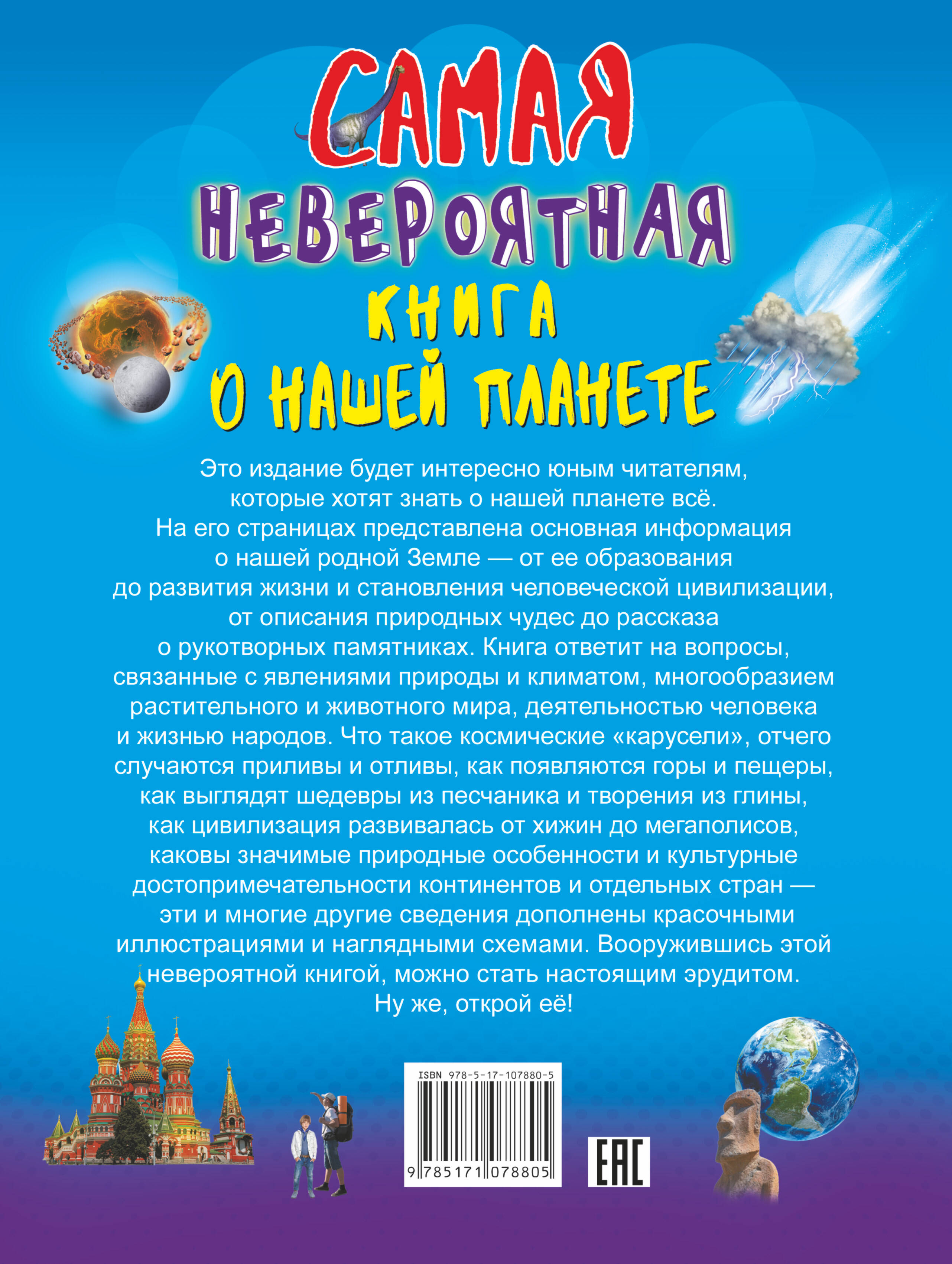 Это издание будет интересно юным читателям, которые хотят знать о нашей планете всё. На его страницах представлена основная информация о нашей родной Земле - от ее образования до развития жизни и становления человеческой цивилизации, от описания природных чудес до рассказа о рукотворных памятниках. Книга ответит на вопросы, связанные с явлениями природы и климатом, многообразием растительного и животного мира, деятельностью человека и жизнью народов. Что такое космические «карусели», отчего случаются приливы и отливы, как появляются горы и пещеры, как выглядят шедевры из песчаника и творения из глины, как цивилизация развивалась от хижин до мегаполисов, каковы значимые природные особенности и культурные достопримечательности континентов и отдельных стран - эти и многие другие сведения дополнены красочными иллюстрациями и наглядными схемами. Вооружившись этой невероятной книгой, можно стать настоящим эрудитом. Ну же, открой её!| Издательство | ИЗДАТЕЛЬСТВО "АСТ" |