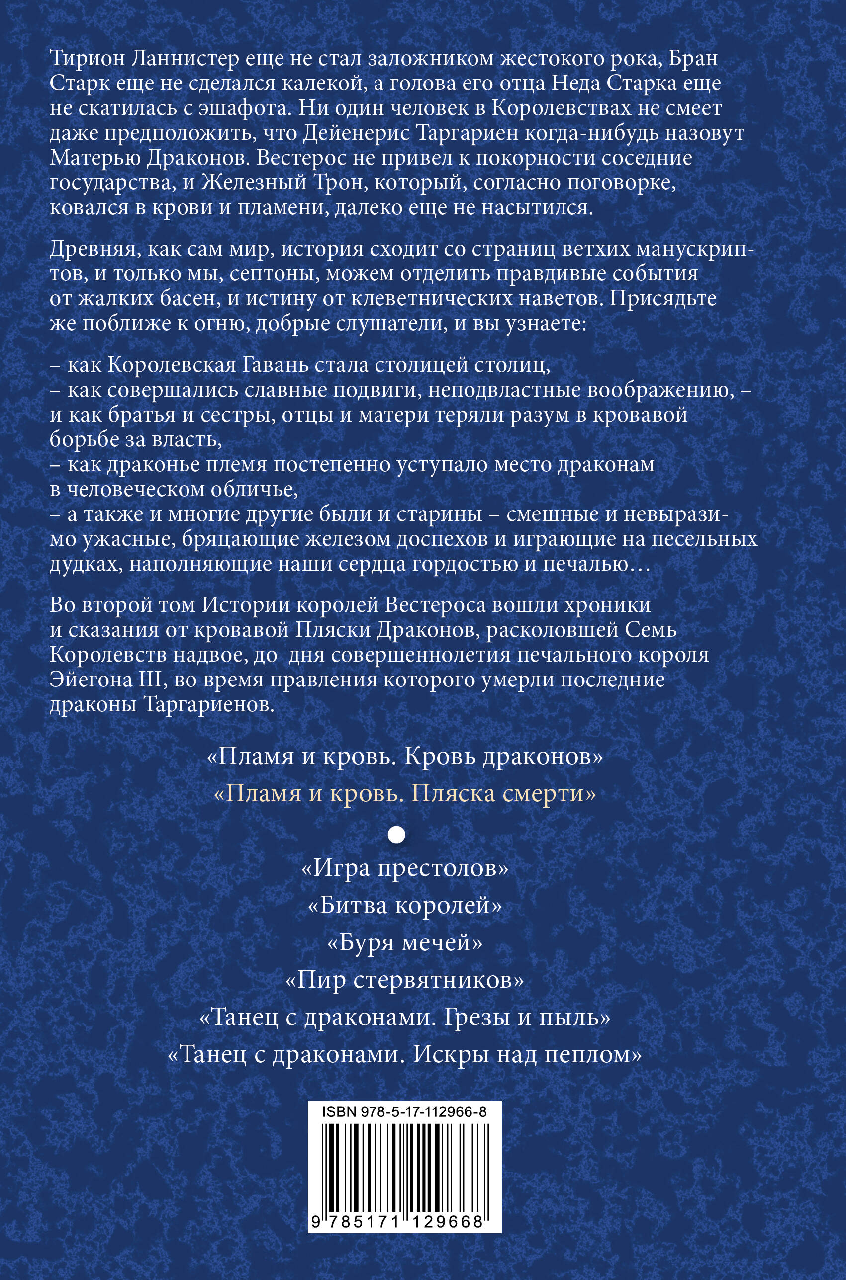 Тирион Ланнистер еще не стал заложником жестокого рока, Бран Старк еще не сделался калекой, а голова его отца Неда Старка еще не скатилась с эшафота. Ни один человек в Королевствах не смеет даже предположить, что Дейенерис Таргариен когда-нибудь назовут Матерью Драконов. Вестерос не привел к покорности соседние государства, и Железный Трон, который, согласно поговорке, ковался в крови и пламени, далеко еще не насытился. Древняя, как сам мир, история сходит со страниц ветхих манускриптов, и только мы, септоны, можем отделить правдивые события от жалких басен, и истину от клеветнических наветов. Присядьте же поближе к огню, добрые слушатели, и вы узнаете: - как Королевская Гавань стала столицей столиц, - как свершались славные подвиги, неподвластные воображению, - и как братья и сестры, отцы и матери теряли разум в кровавой борьбе за власть, - как драконье племя постепенно уступало место драконам в человеческом обличье, - а также и многие другие были и старины - смешные и невыразимо ужасные, бряцающие железом доспехов и играющие на песельных дудках, наполняющее наши сердца гордостью и печалью…| Издательство | ИЗДАТЕЛЬСТВО "АСТ" |
