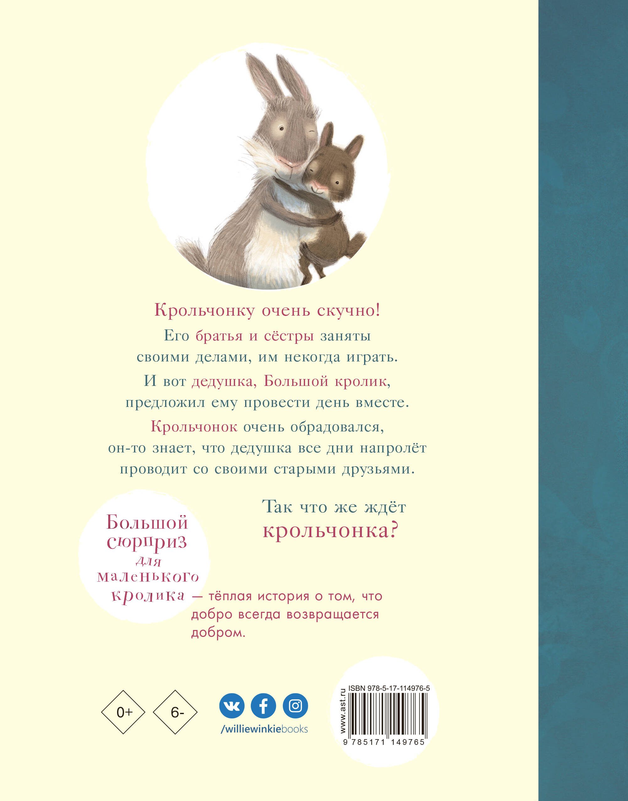 Крольчонку скучно! Его братья и сёстры очень заняты: им надо застилать свои кроватки и помогать маме по дому. И вот дедушка, Большой кролик, предлагает ему провести день вместе. Крольчонок очень обрадовался, ведь он знает, что дедушка целыми днями напролёт ходит в гости к своим друзьям. Так что же ждёт Крольчонка? Свапна Хаддоу - лауреат многочисленных премий, таких как Greenhouse Funny Prize и Fantastic Book Awards 2018. Она живёт в Новой Зеландии вместе с мужем и сыном. "Большой сюрприз для маленького кролика" - тёплая история о том, что добро всегда возвращается добром. Для детей до 3-х лет.