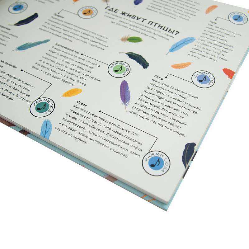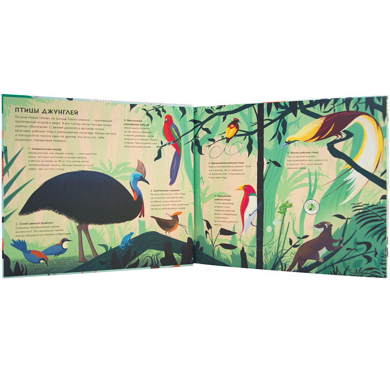 Рассматривая потрясающие иллюстрации Роберта Хантера, маленький читатель побывает в разных уголках нашей планеты, познакомится с пернатыми обитателями всех континентов, а, нажимая на кнопки с нотами, услышит их голоса: вот в дождевом лесу звучит высокий крик попугая, в горах громко каркает ворон, а в центре города выводят свои трели певчие птицы. В конце книги ребенка ждет много интересного - занимательные факты и 10 кнопок, нажав на которые, он сможет прослушать звуки природы еще раз.