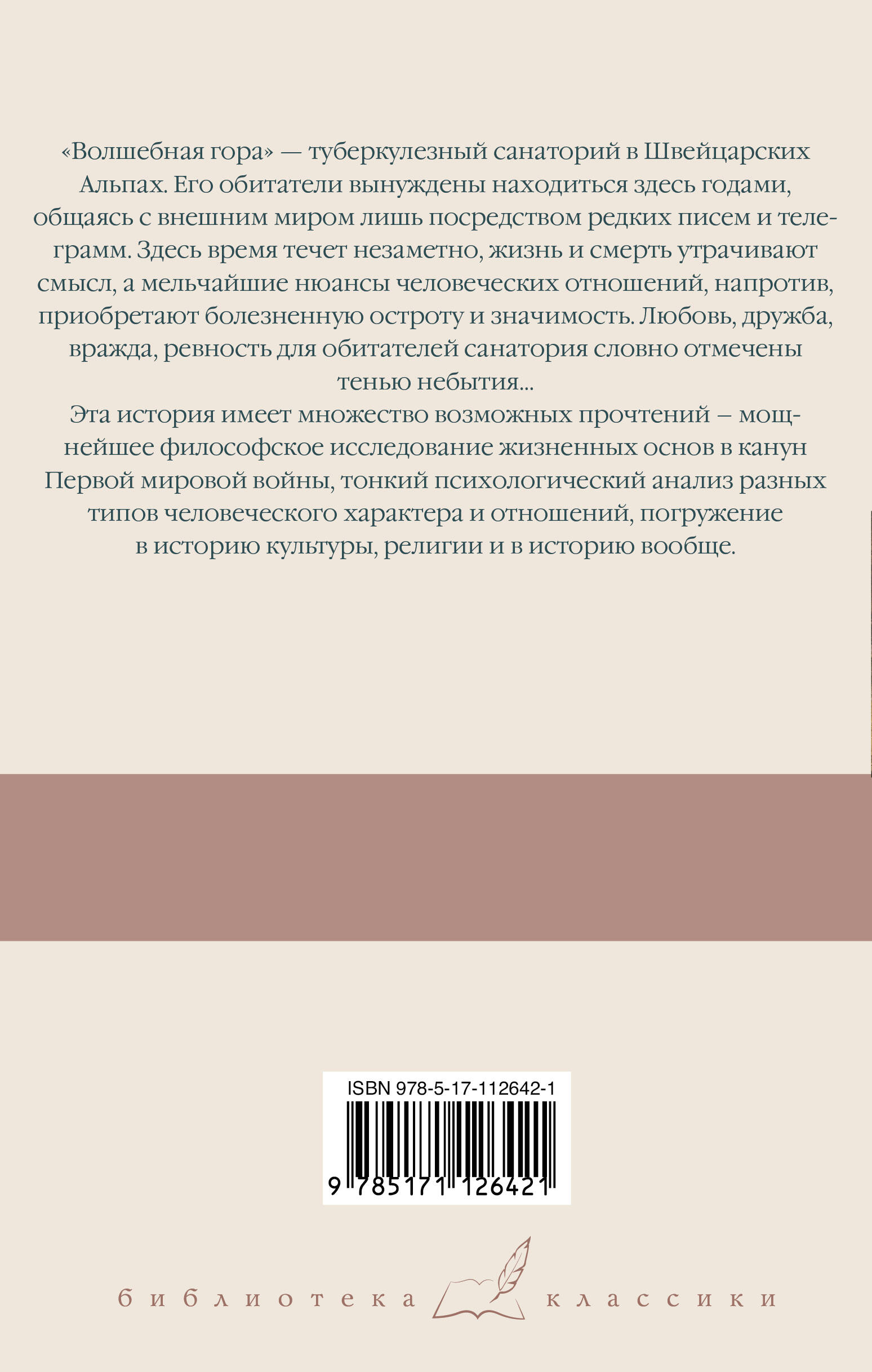 "Волшебная гора" - туберкулезный санаторий в Швейцарских Альпах. Его обитатели вынуждены находиться здесь годами, общаясь с внешним миром лишь посредством редких писем и телеграмм. Здесь время течет незаметно, жизнь и смерть утрачивают смысл, а мельчайшие нюансы человеческих отношений, напротив, приобретают болезненную остроту и значимость. Любовь, дружба, вражда, ревность для обитателей санатория словно отмечены тенью небытия… Эта история имеет множество возможных прочтений - мощнейшее философское исследование жизненных основ в канун Первой мировой войны, тонкий психологический анализ разных типов человеческого характера и отношений, погружение в историю культуры, религии и в историю вообще.| Издательство | ИЗДАТЕЛЬСТВО "АСТ" |