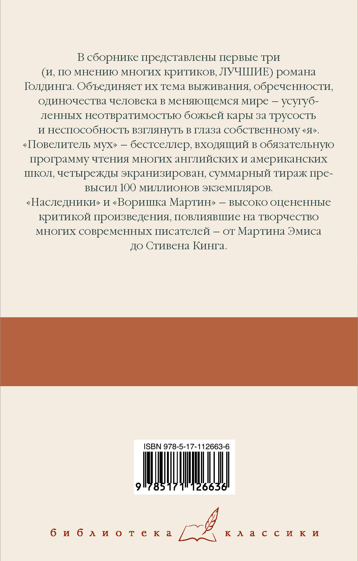 В сборнике представлены первые три (и, по мнению многих критиков, ЛУЧШИЕ) романа Голдинга. Объединяет их тема выживания, обреченности, одиночества человека в меняющемся мире - усугубленных неотвратимостью божьей кары за трусость и неспособность взглянуть в глаза собственному "я". "Повелитель мух" - бестселлер, входящий в обязательную программу чтения многих английских и американских школ, четырежды экранизирован, суммарный тираж превысил 100 миллионов экземпляров. "Наследники" и "Воришка Мартин" - высоко оцененные критикой произведения, повлиявшие на творчество многих современных писателей - от Мартина Эмиса до Стивена Кинга.| Издательство | ИЗДАТЕЛЬСТВО "АСТ" |