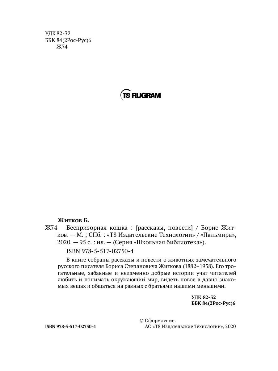 В книге собраны рассказы и повести о животных замечательного русского писателя Бориса Степановича Житкова (1882-1938). Его трогательные, забавные и неизменно добрые истории учат читателей любить и понимать окружающий мир, видеть новое в давно знакомых вещах и общаться на равных с братьями нашими меньшими.| Издательство | Т8 RUGRAM |